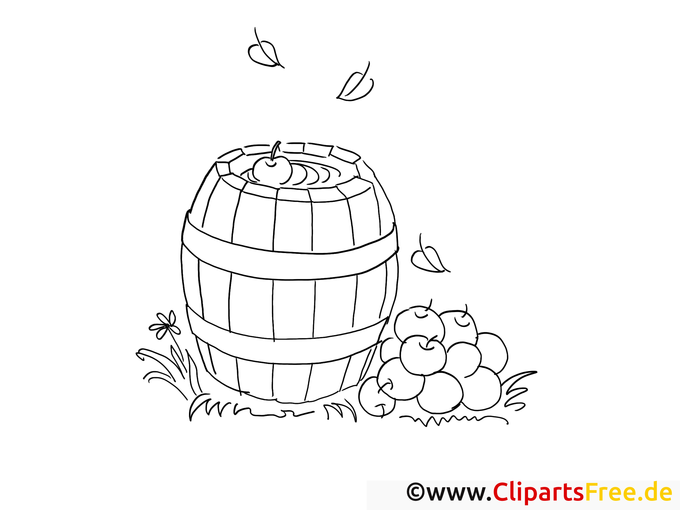 Kostenlose Ausmalvorlage Bauernhof Regentonne und Äpfel
