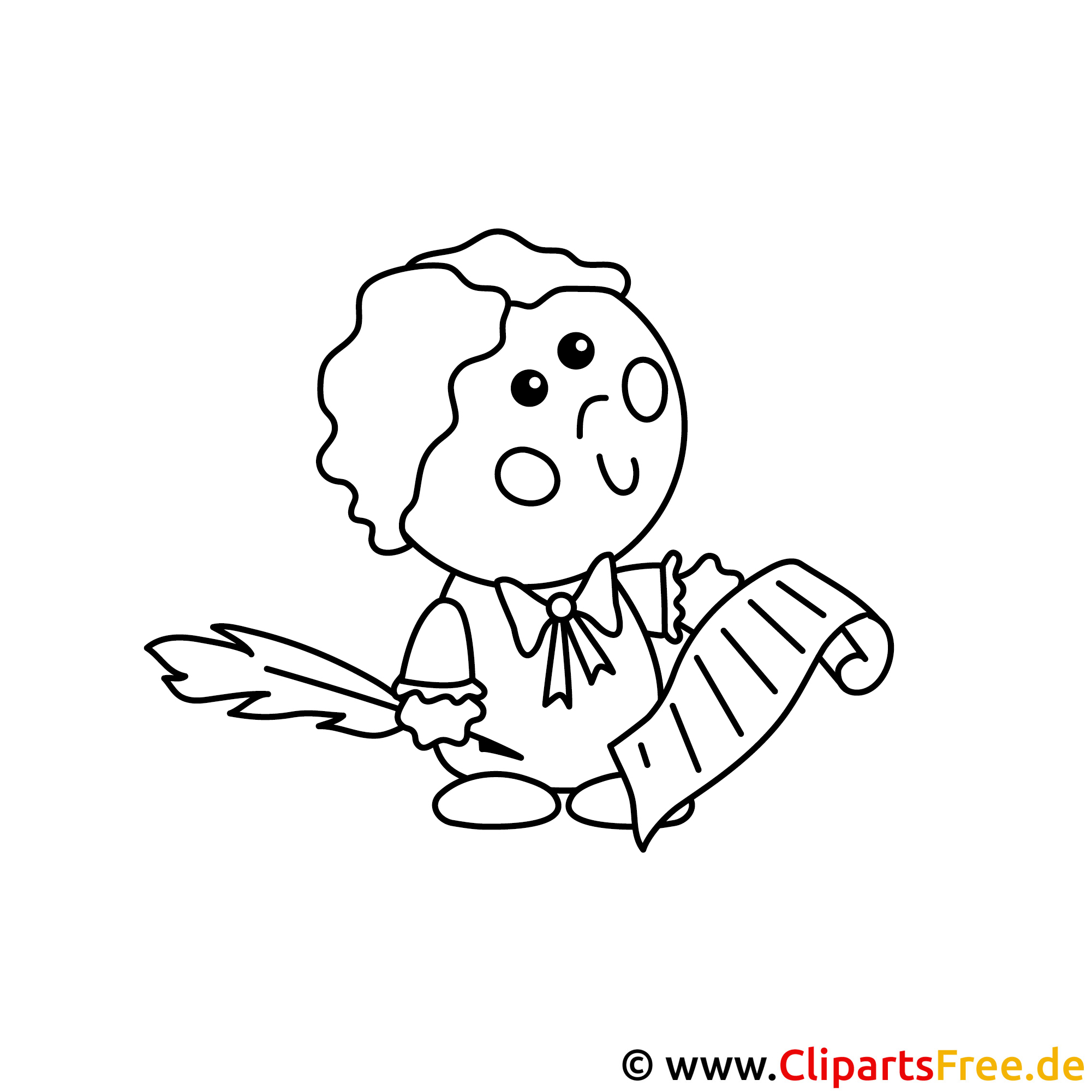 In dieser süßen Malvorlage sehen wir ein kleines, fröhliches Wesen, das eine Feder in der einen Hand hält und mit der anderen ein gerolltes Schriftstück präsentiert. Diese charmante Figur hat große, runde Augen und ein Lächeln, das sofort gute Laune verbreitet. Die schicke Frisur wird durch sanfte Locken vervollständigt. Das Bild weckt sofort Neugier: Was steht wohl auf dem Schriftstück? Vielleicht eine Einladung oder eine Nachricht? Es lädt Förmlichkeiten ein!