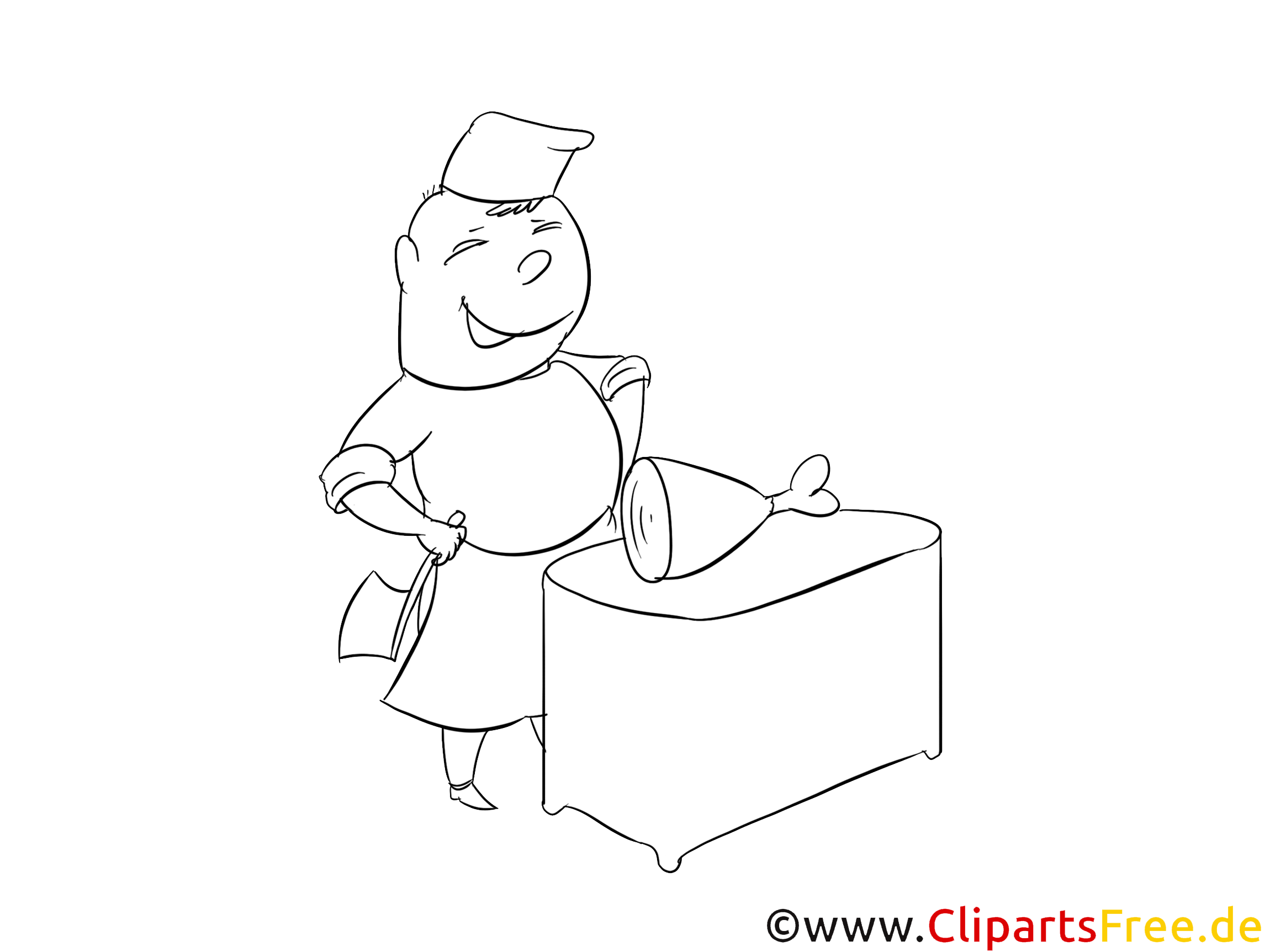 Das Ausmalbild zeigt einen fröhlichen Koch, der stolz am Tisch steht. Ungefähr so, als ob er gerade sein Meisterwerk präsentiert. Da liegt ein großer Schinken auf dem Tisch, und man sieht, dass der Koch mit einem scharfen Messer bereit ist, zu schnippeln. Er hat eine lustige Mütze auf und sein Gesicht strahlt förmlich Freude aus. naja, Mmmh, man könnte fast den Duft der frisch zubereiteten Speisen riechen! Andererseits lädt dieses Bild auch dazu ein, seiner eigenen Fantasie freien Lauf zu lassen und die Farben zu wählen, die einem gerade in den Kopf kommen.