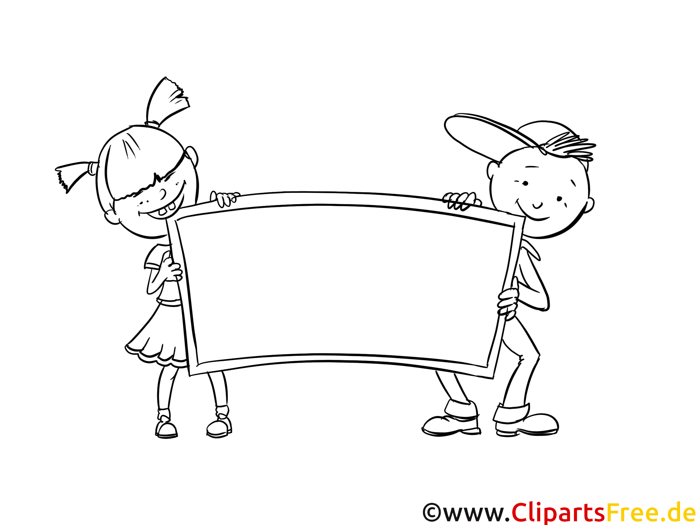 Oh, schau mal! Da sind zwei fröhliche Kinder, die ein großes, leeres Schild hochhalten. Der Junge trägt eine coole Cap und hat ein breites Grinsen im Gesicht. Die Mädchen mit den zwei Zöpfen strahlt vor Freude. Ihre Outfits sind so niedlich, und man kann sich gut vorstellen, dass sie etwas Wichtiges ankündigen oder Werbung machen wollen – vielleicht für einen Kindergeburtstag? Die ganze Szene wirkt einladend und macht sofort Lust, kreativ zu werden!