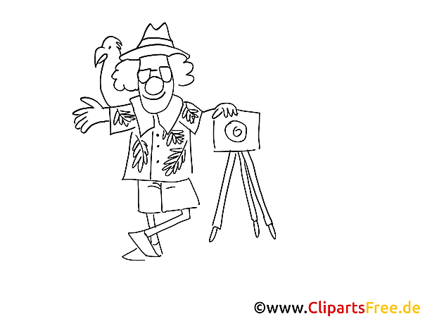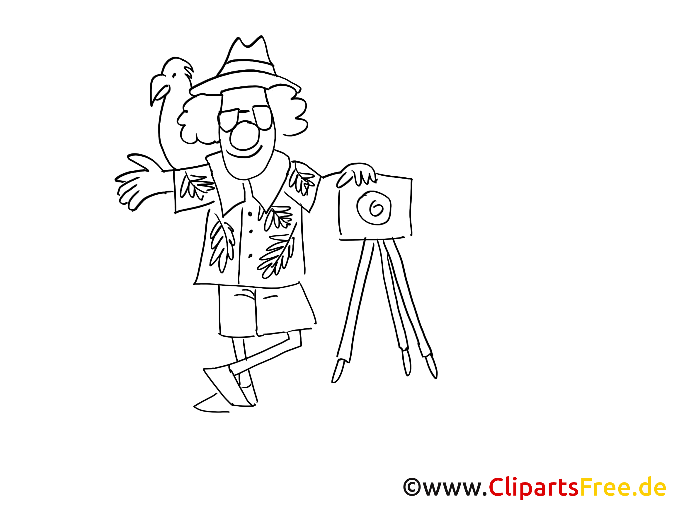 Schau dir dieses lustige Malbild an! Hier sehen wir einen fröhlichen Fotografen mit einem bunten Shirt und einem kleinen, neugierigen Vogel auf seiner Schulter. Er steht lässig mit einer Hand auf der Hüfte und einer anderen Hand, die stolz auf seine Kamera zeigt, die auf einem Stativ steht. Der Fotograf winkt fast, als möchte er sagen: „Hey, schaut her!“ Dabei wirkt er ganz entspannt und glücklich. Es ist nicht nur ein Bild – da steckt eine Geschichte dahinter!