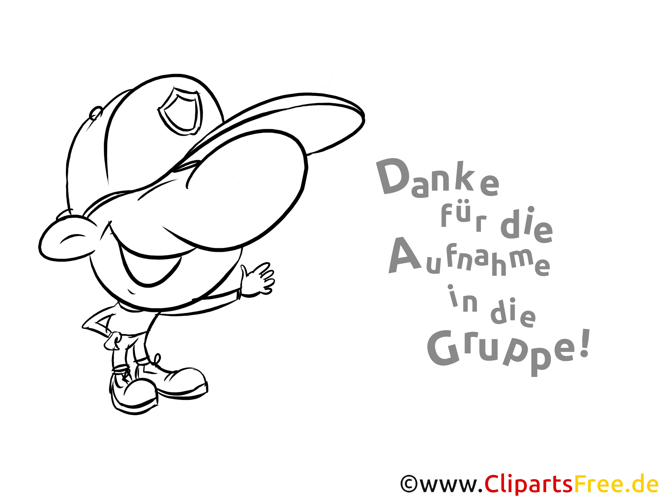 Hier sehen wir ein fröhliches, cartoonhaftes Wesen mit einer großen, einladenden Mütze. Sein Gesicht strahlt vor Freude, und seine Augen funkeln fast! Was mir besonders gefällt, ist die Art, wie er die Hand hebt – so, als würde er sagen: „Hallo, ich bin da!“ Und neben ihm steht ein Spruch: „Danke für die Aufnahme in die Gruppe!“. Das vermittelt sofort ein Gefühl von Gemeinschaft und Freundschaft. Richtig schön bunt könnte das Bild werden, wenn man es ausmalt!