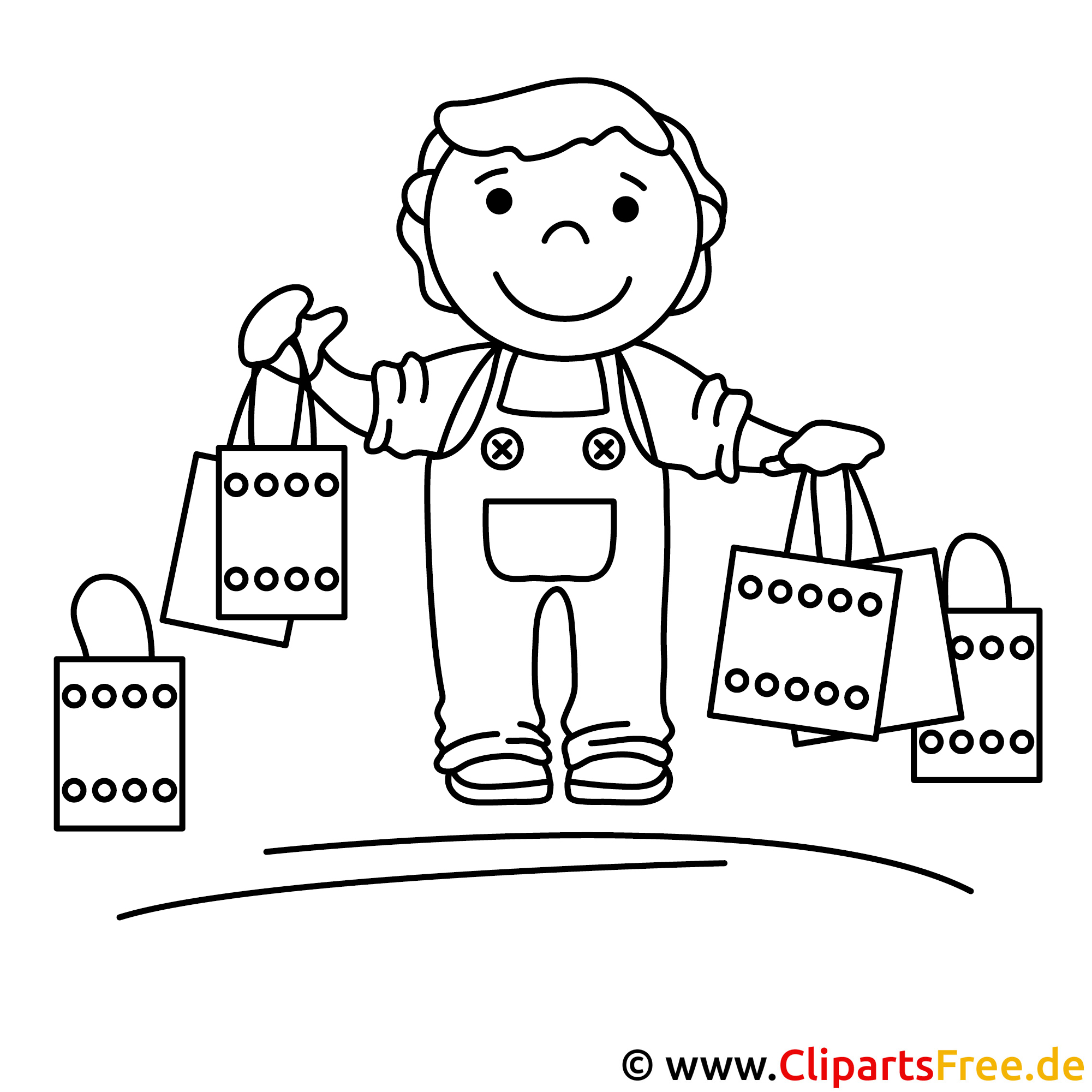 Das Ausmalbild zeigt ein fröhliches Kind, das mit einem breite Lächeln verschiedene Einkaufstaschen in den Händen trägt. Es steht auf einer schlichten, leicht gewölbten Fläche, was dem Bild eine gewisse Dynamik verleiht. Der Junge bildet eine freundliche Atmosphäre, und seine lebhafte Pose vermittelt den Eindruck von Freude am Einkaufen. Die Taschen haben einfache Muster, sodass man sich beim Ausmalen richtig austoben kann. Besonders schön sind die verschiedenen Größen der Taschen, die das Bild abwechslungsreich und spannend machen.