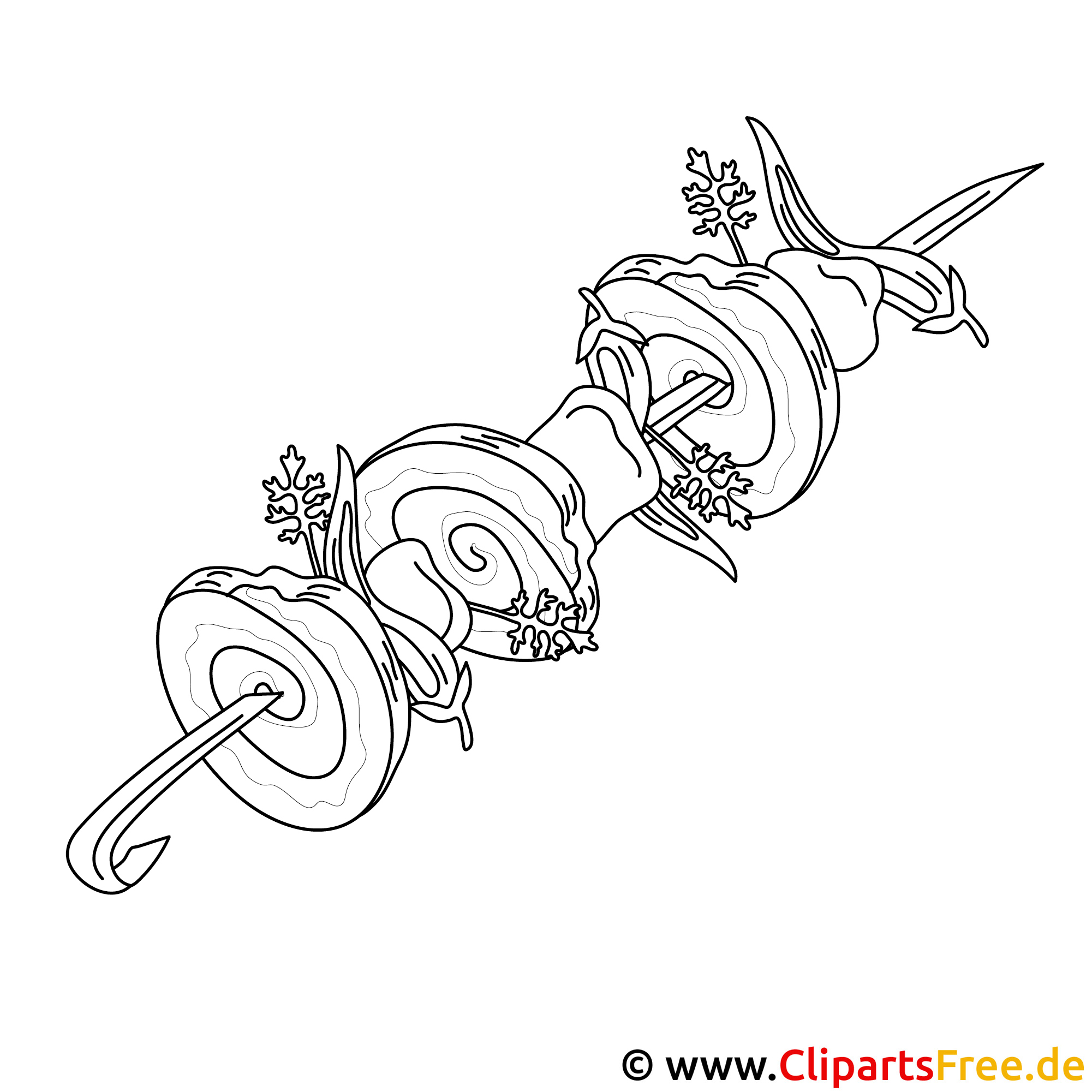 Hier sehen wir ein appetitliches Bild von einem Spieß, der mit verschiedenen Gemüsesorten und vielleicht auch etwas Käse garniert ist. Die bunten Ringe aus Zucchini und Paprika verteilen sich fröhlich auf dem Spieß. Dann die kleinen Blätter – sind das frische Kräuter? Sie geben dem Ganzen einen Hauch von Farbe und verleihen der Zeichnung Leben. Mit einem einzelnen Holzstab am Ende scheint er förmlich einzuladen, dass man ihn sofort ausmalt! Diese Malvorlage ist einfach perfekt für kleines kreatives Ausprobieren.