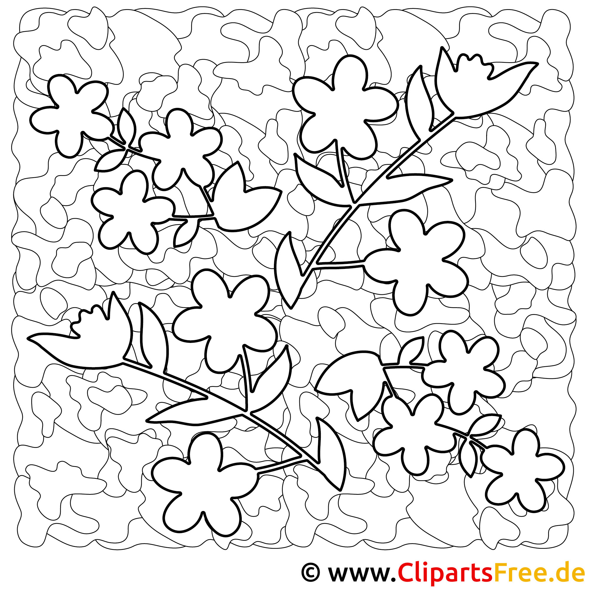 Das Ausmalbild zeigt eine entzückende Anordnung von Blumen. Die verschiedenen Blüten, alle in unterschiedlichen Formen und Größen, schlängeln sich harmonisch um grüne Blätter. Man sieht fünf-petallierte Blumen und einige mit schmaleren, längeren Blütenblättern. Der Hintergrund ist mit abstrakten Mustern gefüllt, die eine lockere Textur schaffen. Dadurch entsteht eine fröhliche Atmosphäre, die perfekt für kreative Stunden geeignet ist. Die Blumen könnten jedem Raum ein wenig Leben einhauchen, oder?