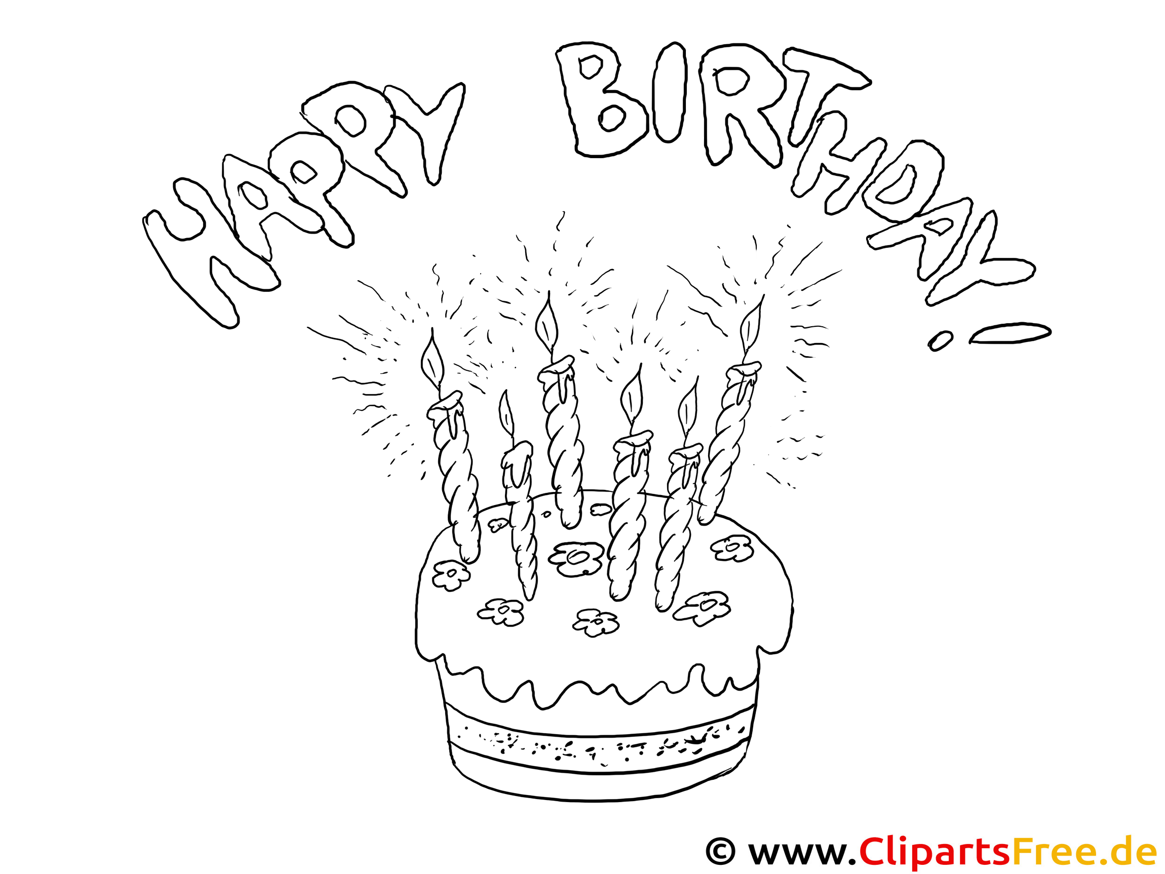 Hier ist ein fröhliches Ausmalbild, ganz im Zeichen von Geburtstagsfeiern! Der Kuchen ist ganz schön verziert, mit bunten Blümchen und fünf Kerzen darauf, die darauf warten, angezündet zu werden. Über dem Kuchen steht in großen, lustigen Buchstaben „HAPPY BIRTHDAY!“. Das Bild strahlt Freude und Feierlaune aus – es ist einfach perfekt, um die Vorfreude auf den besonderen Tag festzuhalten. Der Kuchen steht auf einem kleinen Teller, der ganz schlicht aussieht, aber alles kommt super zur Geltung. tja, Man könnte fast den Duft von frischem Gebäck riechen… Wenn man sich darauf konzentriert, könnte man sogar darauf warten, dass der Kuchen gleich angeschnitten wird!