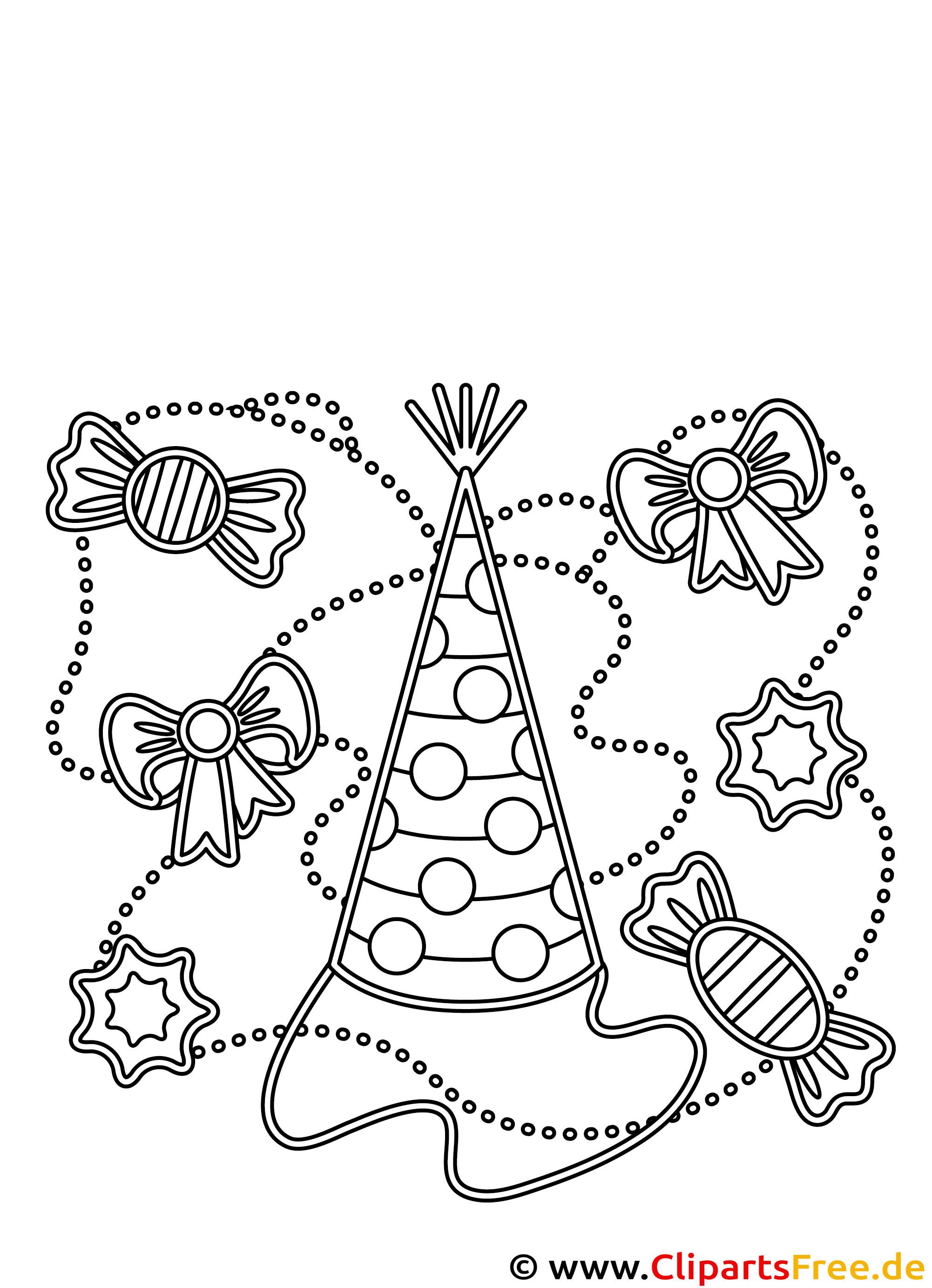 Die Malvorlage zeigt eine fröhliche Clownshut, umgeben von süßen Bonbons und hübschen Schleifen. Die klare Linienführung macht es einfach, die verschiedenen Elemente zu erkennen. Außerdem wirken die bunten Bonbons und der Hut zusammen total einladend! Die verschiedenen Formen und Details versprechen Spaß beim Ausmalen, und die gesamte Komposition strahlt eine ganz besondere Feierlaune aus.