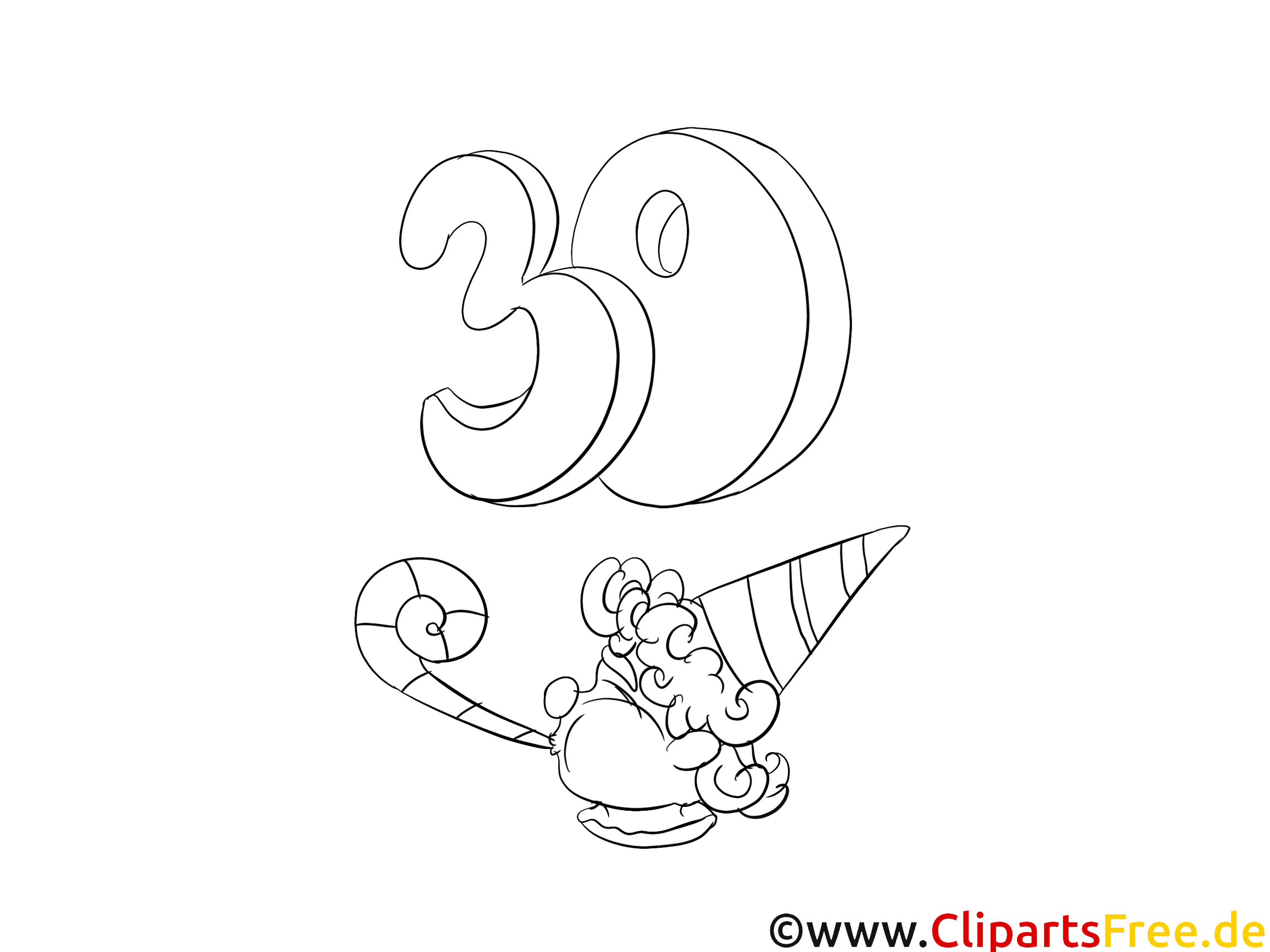 In diesem fröhlichen Ausmalbild sieht man eine bunte, lustige Clownfigur, die fröhlich wirkt und sich auf eine Party freut. Der Clown trägt einen kunterbunten Hut und hat eine große, rundliche Nase. Über ihm schwebt die Zahl „30“, die auch sehr verspielt gestaltet ist. Man könnte sagen: die Komposition verbreitet einfach gute Laune! Hinzu kommt eine süße Zuckerstange, die der Clown hält. hm, Ideal für besondere Anlässe wie Geburtstage oder ein Jubiläum.