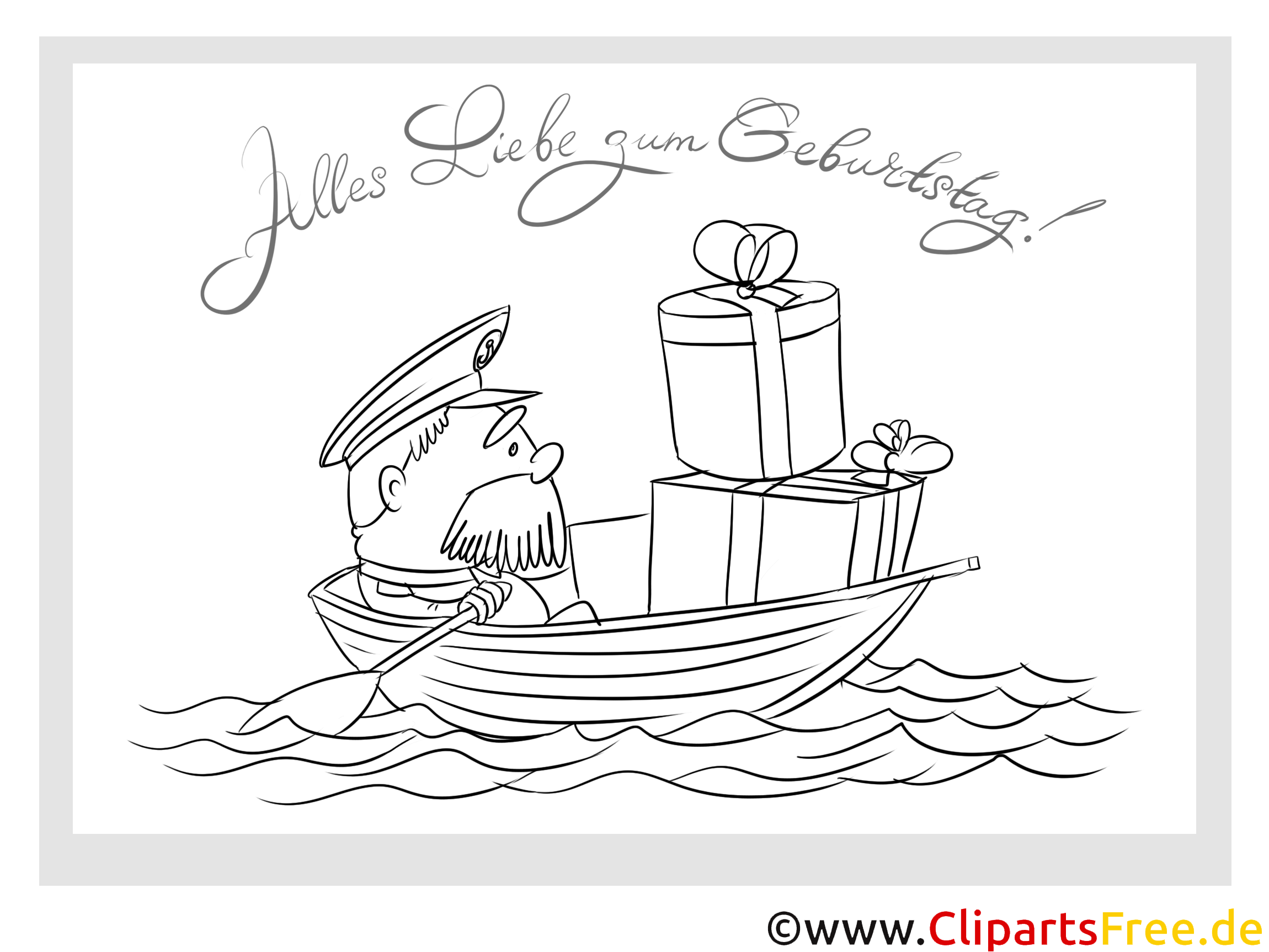 Das Bild zeigt einen fröhlichen Kapitän, der in einem kleinen Boot unterwegs ist. Er hat einen dicken, lustigen Bart und trägt eine schicke Mütze. In seinem Boot sind mehrere Geschenke, die bunt verpackt sind und mit bunten Bändern versehen. Die Szene spielt auf einer leicht gewellten Wasseroberfläche, was dem Bild eine lebendige Note verleiht. Und da steht auch noch eine süße Schrift oben: "Alles Liebe zum Geburtstag!" Wie schön, oder? Es macht einfach Freude, dieses Bild anzuschauen und Inspiration für kreative Aktivitäten zu finden.