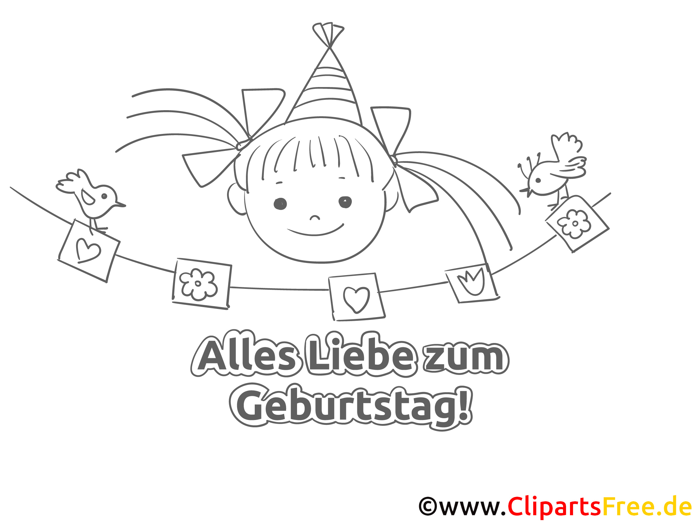 Das Motiv dieser Malvorlage zeigt ein fröhliches Kind mit Zöpfen, das eine Geburtstagshüte trägt. Um das Kind herum sind kleine Vögelchen und eine Girlande mit verschiedenen, liebevoll gestalteten Bildern zu sehen. Es ist einfach, aber sehr einladend und zaubert ein Lächeln ins Gesicht. Der Text „Alles Liebe zum Geburtstag!“ steht deutlich oben. Man kann schon fast die Vorfreude auf den nächsten Geburtstag spüren – die bunten Farben, die man mit diesem Bild verbinden kann, sind unendlich!