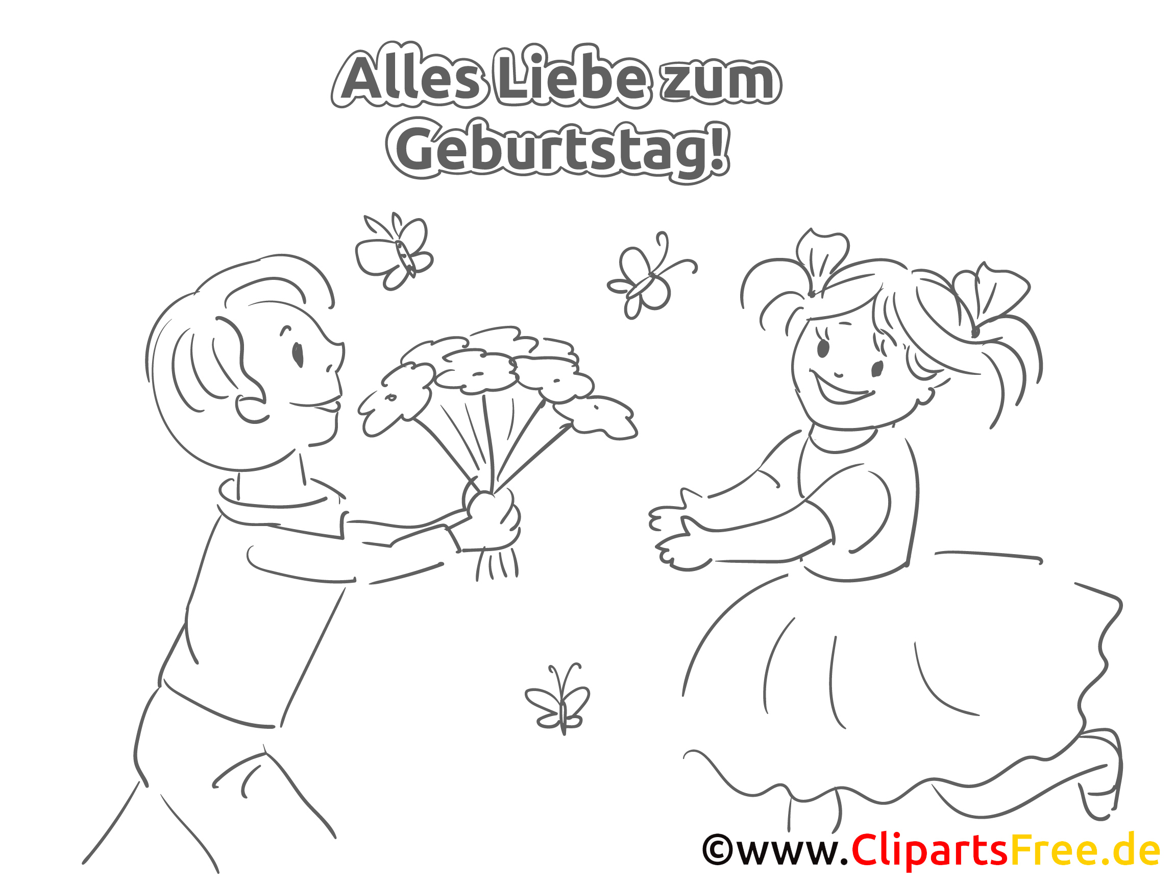 In diesem herzerwärmenden Ausmalbild sehen wir zwei fröhliche Kinder, die sich in einem schönen, bunten Garten gegenüberstehen. Der Junge hält ein strahlendes Sträußchen mit bunten Blumen in der Hand und schaut das Mädchen mit einem Lächeln an. Sie trägt ein hübsches Kleid und wirkt richtig begeistert, während sie ihm entgegenläuft. Um sie herum fliegen fröhlich ein paar kleine Schmetterlinge – eine zauberhafte Szene, die sofort gute Laune verbreitet und Ideal für einen Geburtstag ist!