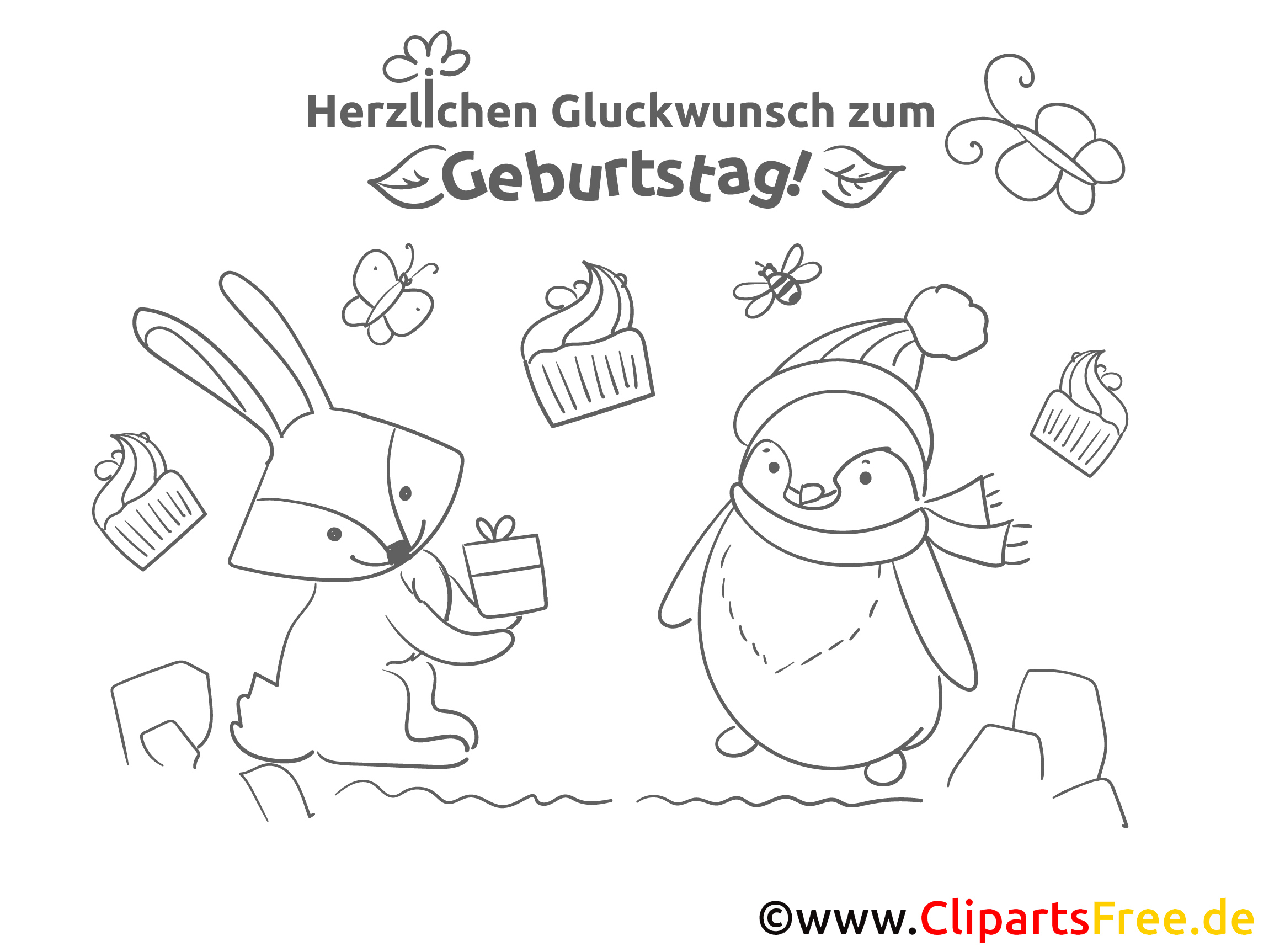 Das Ausmalbild zeigt ein echt fröhliches Geburtstagsmotiv. Ein niedlicher, lustiger Hase steht da, mit einem Geschenk in der Hand. Und schau mal, da ist ein kleiner Pinguin! Der trägt einen schicken Schal und einen Hut, super stylisch. Um die beiden herum fliegen ein paar bunte Schmetterlinge, und ein paar Cupcakes stehen auch daneben. So viel Freude! Die Worte „Herzlichen Glückwunsch zum Geburtstag!“ runden das Ganze ab und machen das Bild perfekt für Geburtstagseinladungen oder -karten.