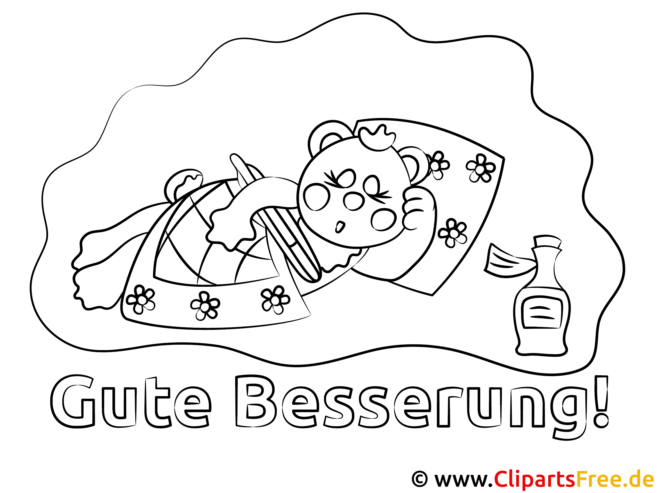 Das Bild zeigt einen niedlichen kleinen Bären, der sich in eine bunte Decke eingewickelt hat. Er liegt gemütlich im Bett und hat eine besorgte, aber auch etwas verträumte Miene. Neben ihm steht eine Flasche mit einem Heilmittel, vielleicht ein warmes Getränk oder ein bisschen Hustenbonbons – wer weiß das schon, aber es sieht auf jeden Fall nach etwas Beruhigendem aus. Der Hintergrund ist mit schönen, fröhlichen Blumenmuster geschmückt, was dem Bild etwas Positives verleiht, trotz der ganzen Genesungs-Geschichte. Und der Text „Gute Besserung!“ in großen, sanften Buchstaben macht das Bild noch einladender.... Eine schöne Vorlage für alle, die Trost spenden möchten.