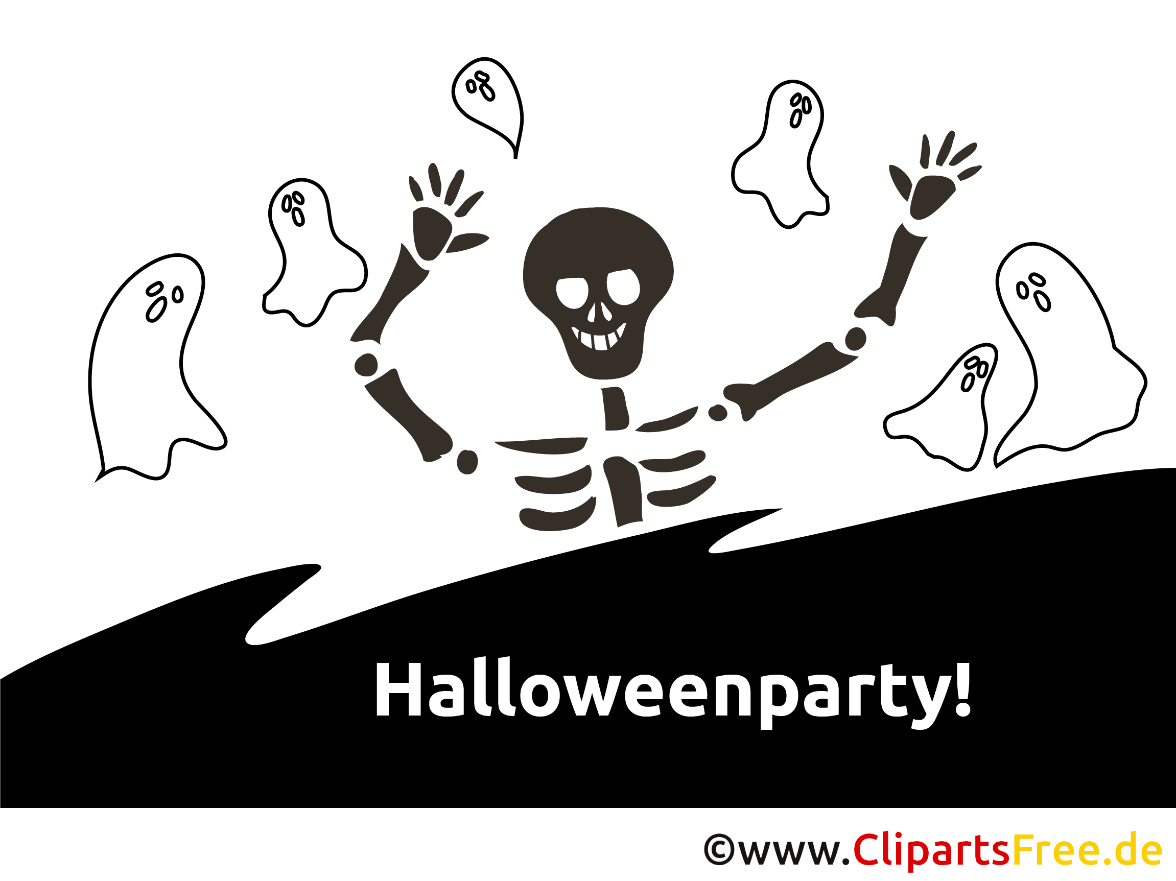 Hier wird eine fröhliche Halloweenparty mit einem schelmischen Skelett gefeiert! Es steht mit hochgerissenen Händen da, als wäre es bereit zu tanzen. Umgeben von niedlichen, weißen Gespenstern. Die Gruseligkeit wird dadurch anschaulich, dass die Geister fast wie freundliche Wesen aussehen, die zum Feiern einladen. Die Kombination von Skelett und Geistern schafft eine lustige, manches Mal ein bisschen skurrile Atmosphäre – genau das, was man für Halloween braucht!