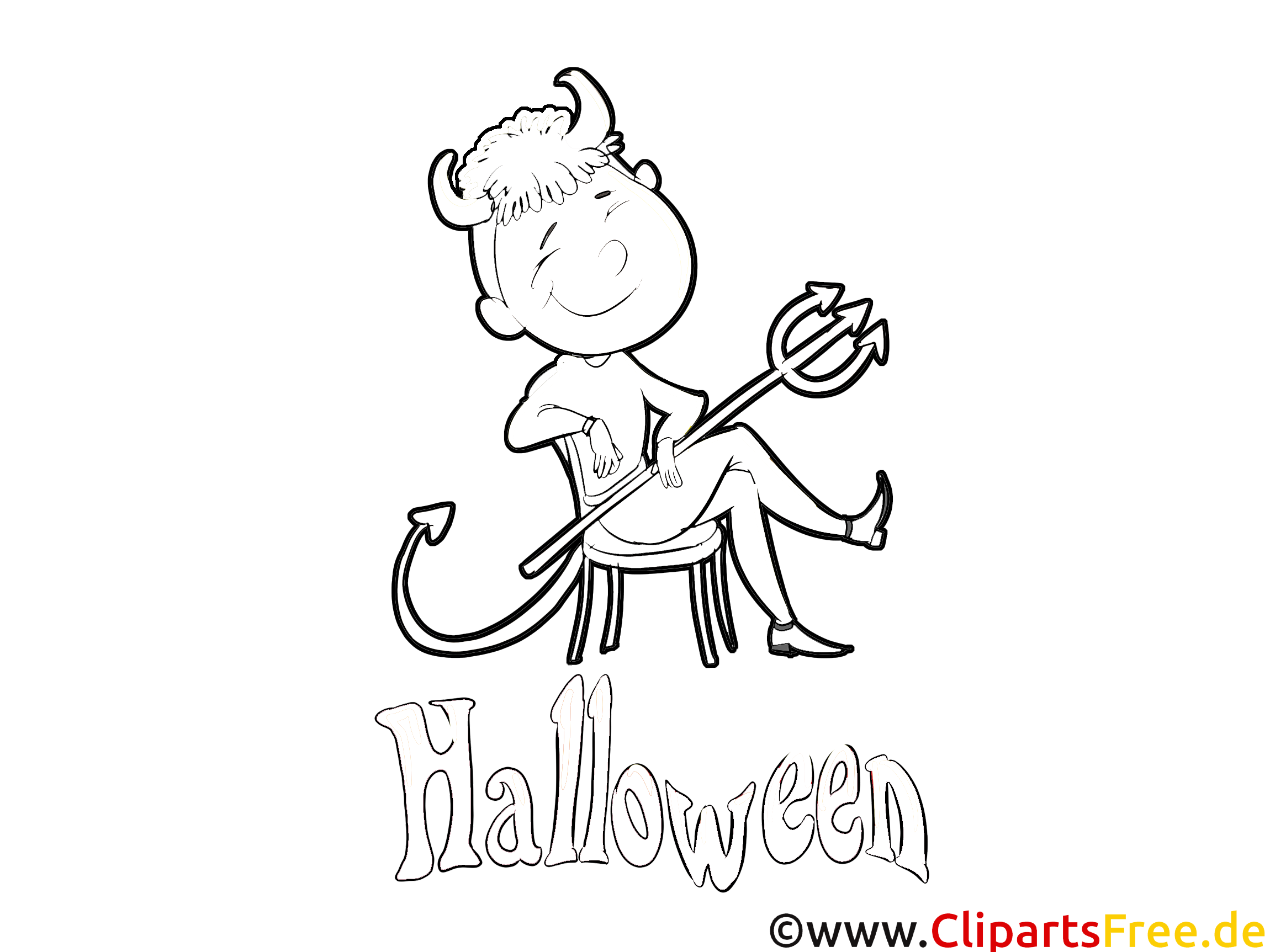 Das Bild zeigt eine lustige Figur, die gerade auf einem Stuhl sitzt – ein kleiner Teufel! Mit einem breiten Grinsen und einem Schwanz, der fröhlich nach oben zeigt, hat er eine kleine Teufelsgabel in der Hand. Diese Figur strahlt eine Mischung aus Schalkhaftigkeit und Verspieltheit aus. Der Schriftzug „Halloween“ wirkt gleichzeitig freundschaftlich und einladend, ganz im Gegensatz zu dem, was man von einem echten Teufel erwarten würde. Das Motiv ist perfekt für eine Halloween-Malvorlage – ideal für Kinder, die Spaß beim Ausmalen haben. Die Details sind klar und einfach gehalten, sodass sich die Farben wunderbar entfalten können.
