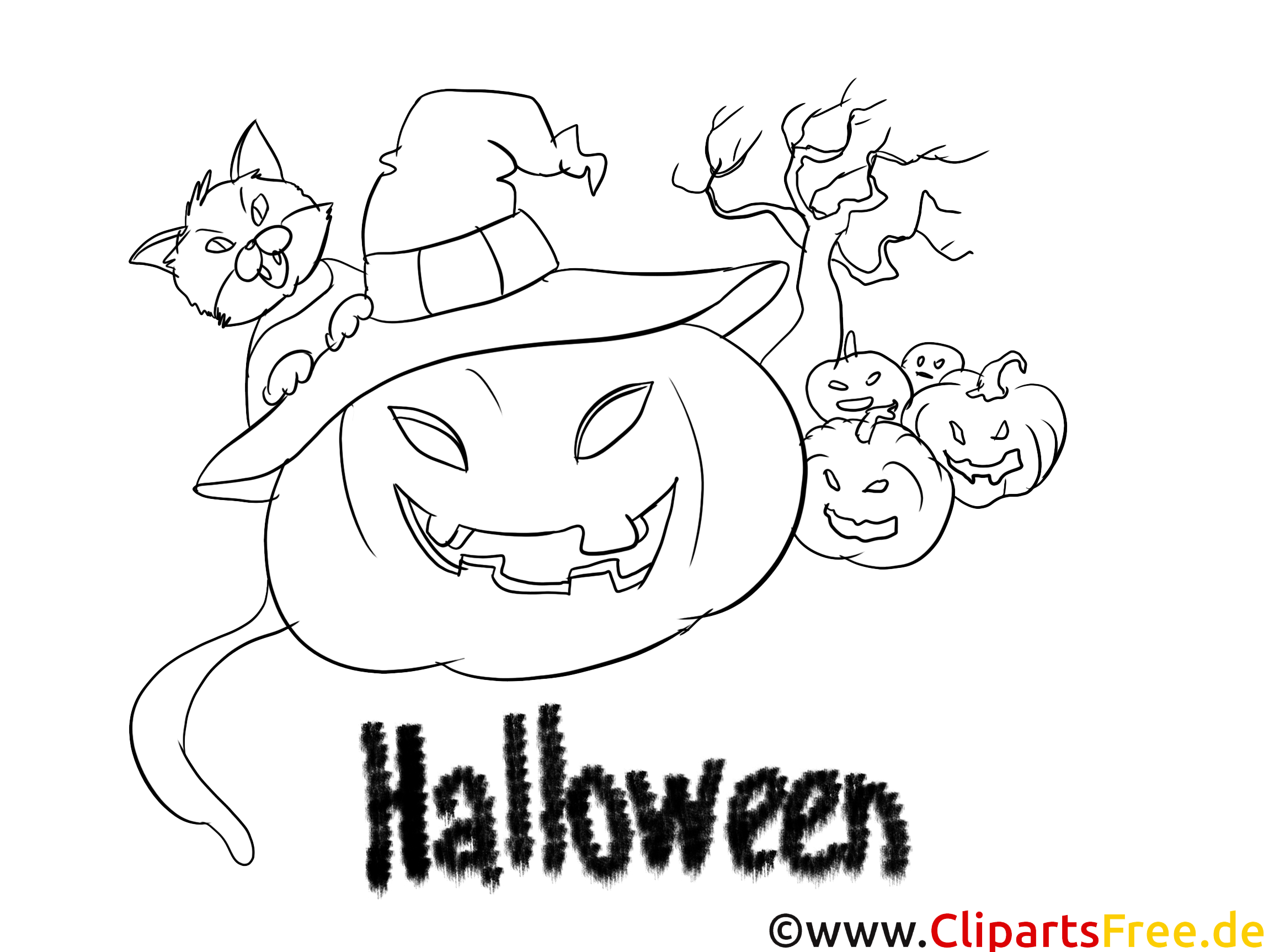 Ah, Halloween! Das Bild, das hier gezeigt wird, versetzt dich sofort in die festliche Stimmung. Ein großer, lächelnder Kürbis steht im Mittelpunkt, mit bösen Augen und einem grinsenden Mund. Aber das ist noch nicht alles! Auf seinem Kopf sitzt ein kleiner, frecher Kater mit einem lustigen Hut. Die Szenerie wird vervollständigt durch einige kleinere Kürbisse im Hintergrund und einen mysteriösen, knorrigen Baum. hm, Und ganz wichtig, das Wort „Halloween“ prangt unterhalb des Kürbisses in einer verschnörkelten Schriftart. Ehrlich gesagt, dieser Anblick animiert dazu, eigene Farben und Ideen hinzuzufügen.
