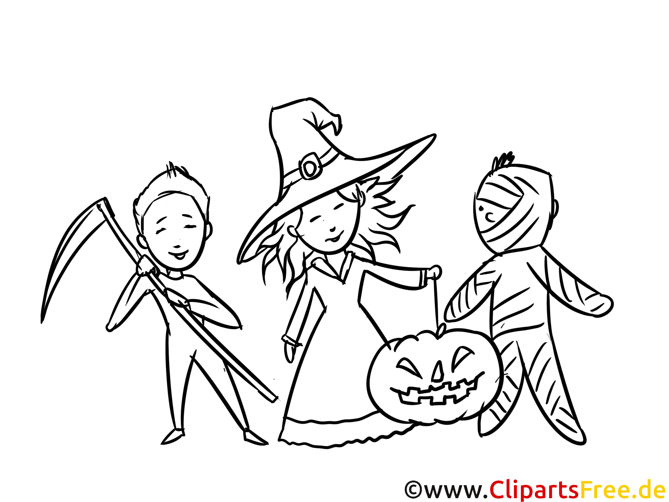 Hier sehen wir ein ganz bezauberndes Ausmalbild. Es zeigt drei fröhliche Kinder. Sie haben sich verkleidet: ein kleines Mädchen in einem schaurigen Hexenkostüm mit einer großen Kappe – wirklich toll! Daneben steht ein Junge, der mit einer Sense ganz geheimnisvoll wirkt. Und der dritte, eine kleine Mumie, lächelt ganz verschmitzt. ähm, Natürlich darf der gruselige Kürbis nicht fehlen, der es in sich hat! Perfekt, um richtig Halloween-Stimmung zu verbreiten!