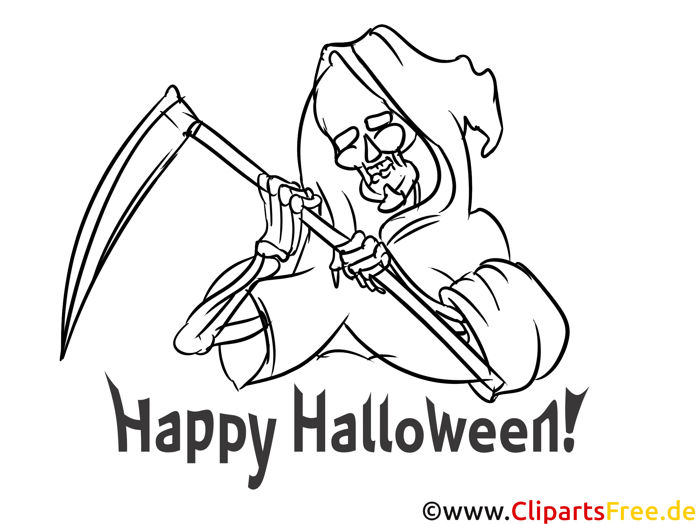 Also, hier haben wir ein ganz besonderes Ausmalbild! Es zeigt eine sehr interessante Figur – einen Sensenmann, naja, in einem leicht gruseligen, aber auch etwas lustigen Stil, würde ich sagen. Der Sensenmann hat ein freundliches Lächeln, was ihn irgendwie sympathisch macht, trotz der ganzen groben Machart. Um ihn herum ist der Schriftzug „Happy Halloween!“, der die ganze Stimmung ganz praktisch unterstreicht. Es ist ein tolles Malbild für Kinder, die den Halloween-Spirit erleben wollen, ohne sich zu gruseln, das ist wichtig, oder?