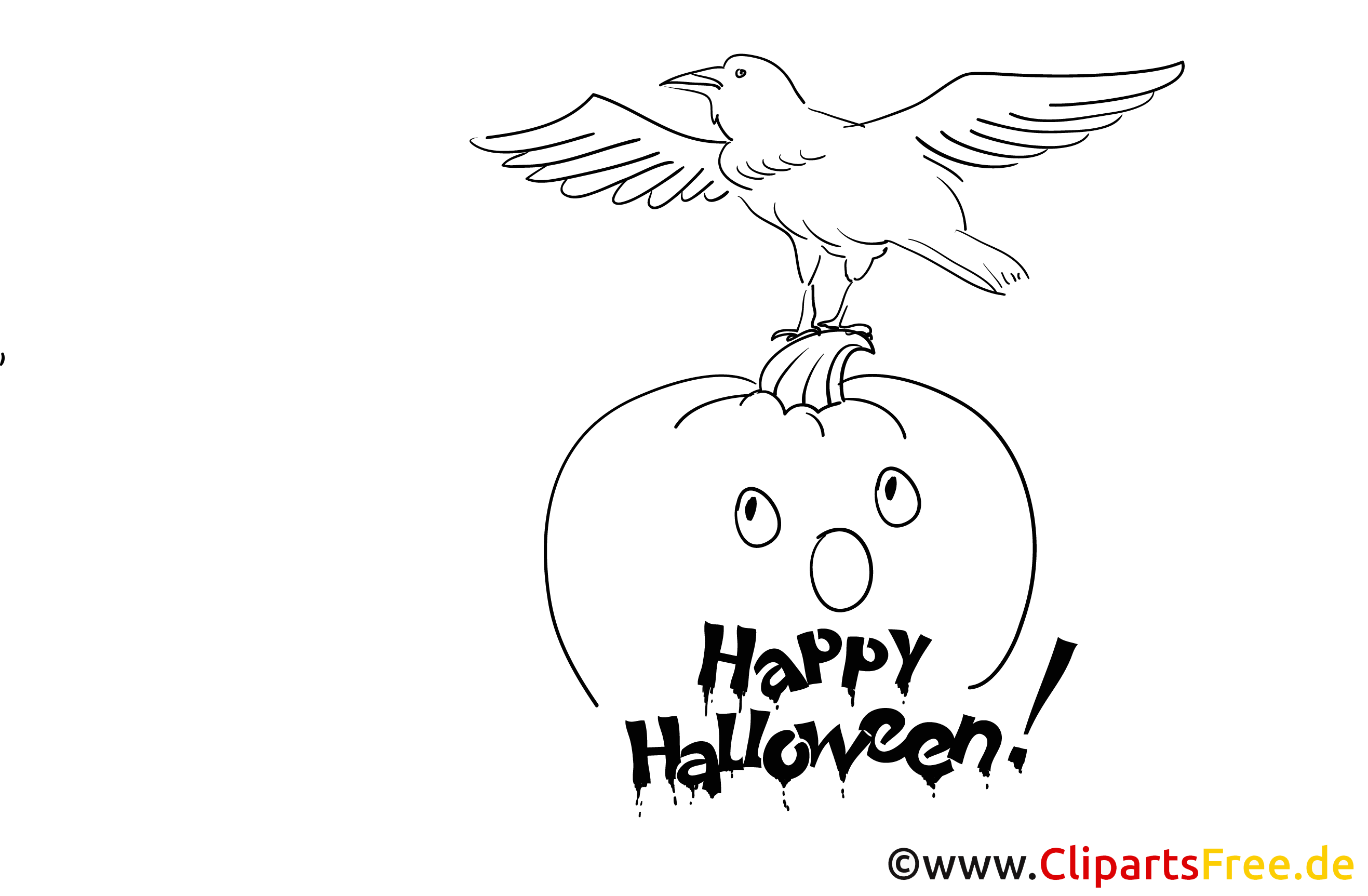 Die Darstellung zeigt eine fröhliche Halloween-Szene: Ein großer, runder Kürbis mit einem aufmerksamen Gesicht ist im Mittelpunkt. Auf seinem orangefarbigen Häuptling sitzt ein flugunfähiger Rabe. Er breitet seine Flügel weit aus und wirkt dabei sehr lebhaft. Unter dem Kürbis steht in großen, bunten Lettern: „Happy Halloween!“ Es strahlt eine fröhliche Atmosphäre aus, die gleichzeitig eine spannende Halloween-Stimmung vermittelt.