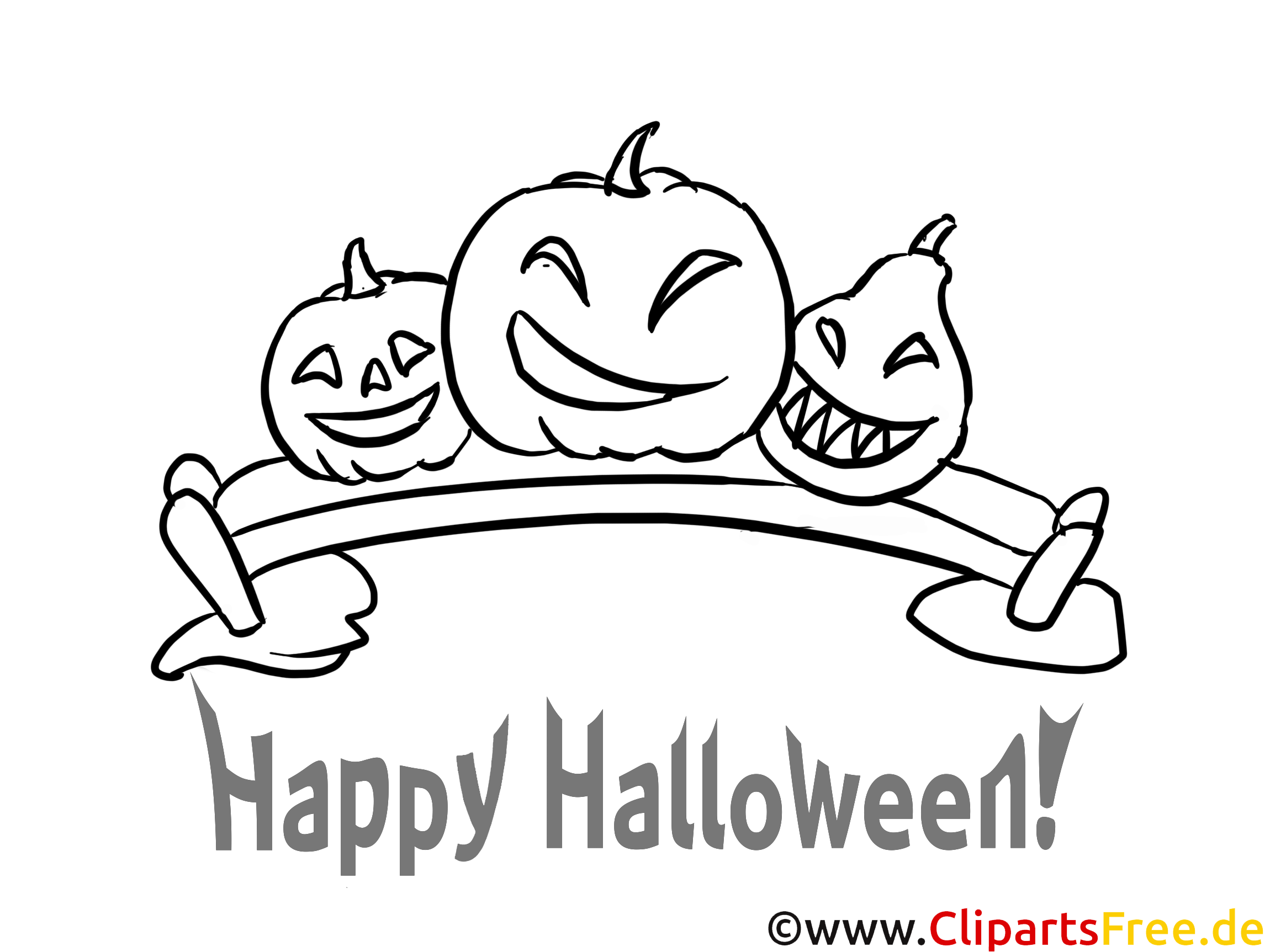 In diesem fröhlichen Ausmalbild für Halloween sind drei grinsende Kürbisse zu sehen! Jeder von ihnen hat ein eigenes, lustiges Gesicht: der mittlere schaut besonders einladend, während die anderen beiden mit ihrem schaurig-schönen Lächeln das gruselige, aber auch spielerische Ambiente perfekt unterstreichen. Ob in der Kinderzimmer-Wanddekoration oder im Schulheft, dieses Motiv zaubert allen ein Lächeln aufs Gesicht! Darüber steht in großen, grauen Buchstaben „Happy Halloween!“, was das Bild noch mehr in diese schaurig-fröhliche Zeit des Jahres einführt.