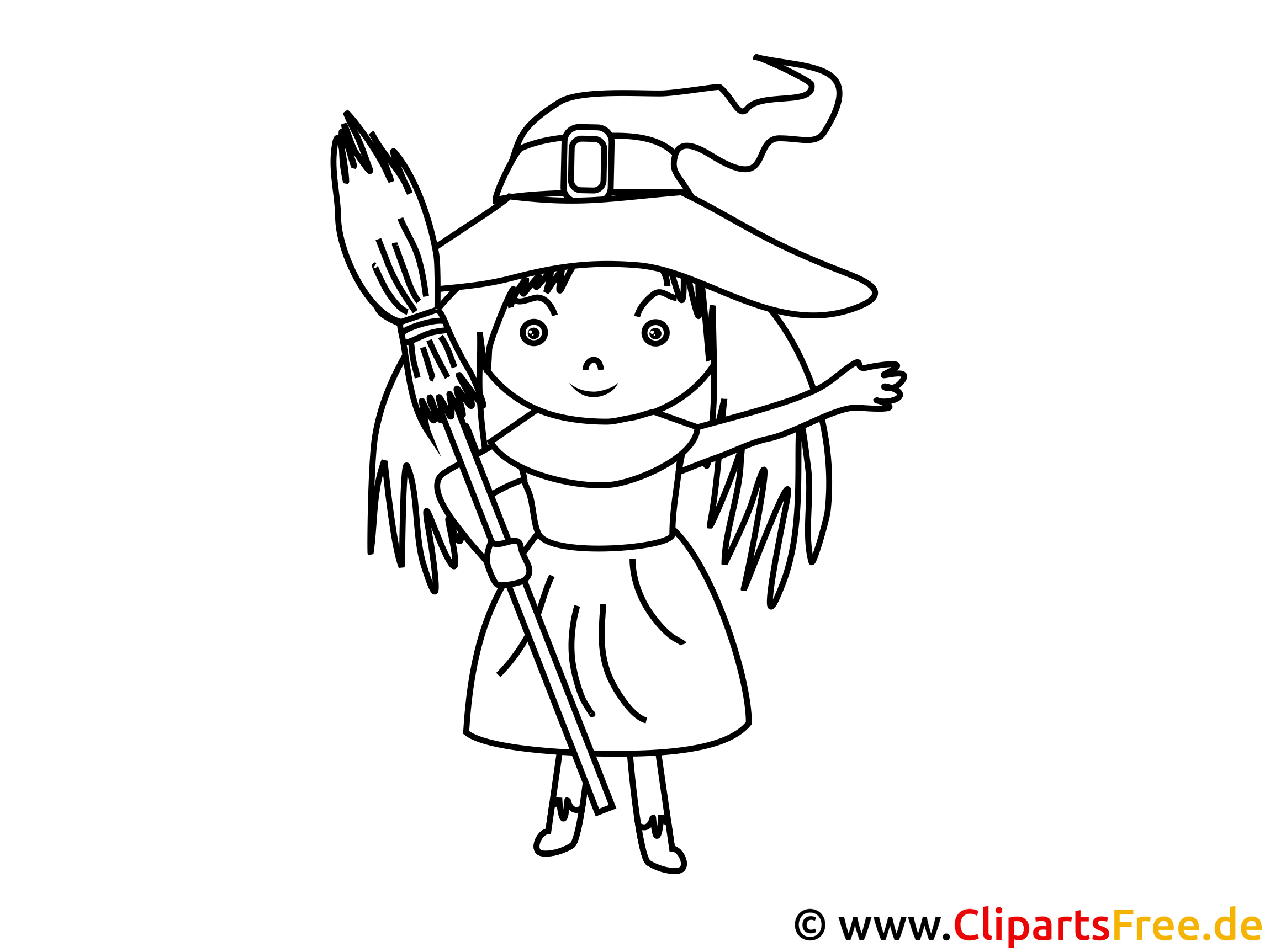 Kleine Hexe mit Besen Bild-Malvorlage zum Drucken und Ausmalen