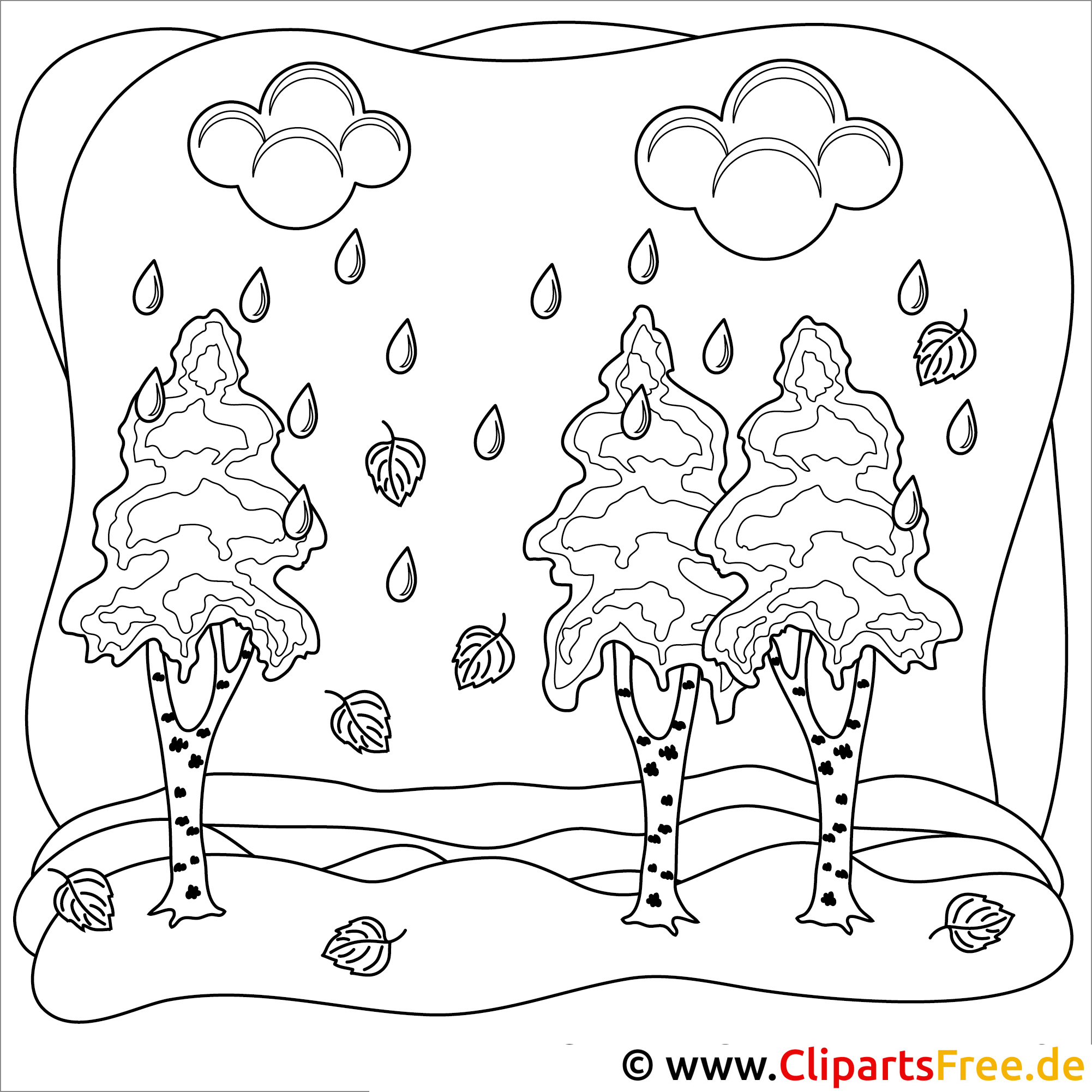 Der Zeichenstil ist verspielt, aber nicht übertrieben kompliziert – perfekt, um mit Farben begeistert umzugehen?!. Die klaren Linien machen es einfach, die unterem Details wie die Tropfen und kleinen Blätter auszufüllen. Die Wolken, nun ja, die Wolken sind auf nette, einfache Weise gezeichnet, ganz schüchtern. Es gibt verschiedene Formen und Muster in den Bäumen, also tolle Möglichkeiten, damit zu experimentieren. Feine Schatten könnten auch mit einem Bleistift hinzugefügt werden, wenn man möchte. Das Bild lädt ganz klar zum Entdecken und Ausprobieren ein, so macht Malen einfach mehr Spaß!