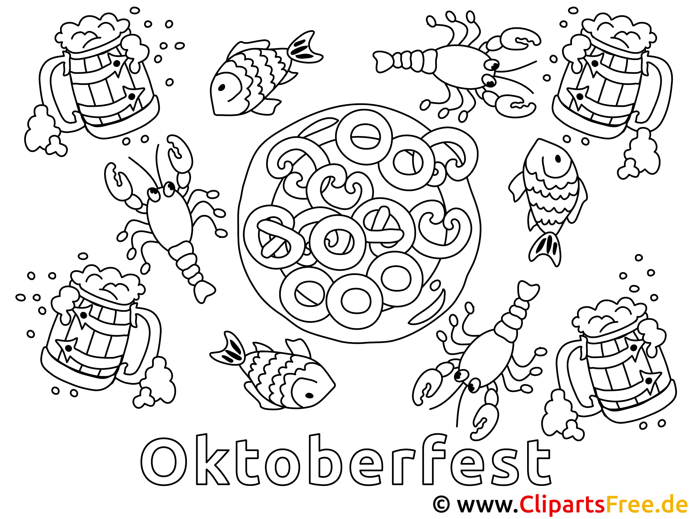 Stell dir vor, du siehst ein fröhliches Bild, das das Oktoberfest bei uns in Deutschland feiert. In der Mitte ist ein großer, runder Teller mit Brezeln, rundherum tummeln sich kleine Fische und zappelnde Krebse. Und ganz wichtig, das Bild hat einige prall gefüllte Bierkrüge mit schaumigen Getränken! Die ganze Szenerie strahlt Lebensfreude und gesellige Stimmung aus, perfekt für ein Ausmalbild. Und hey, die Buchstaben "Oktoberfest" am unteren Rand laden förmlich dazu ein, kreativ zu werden.