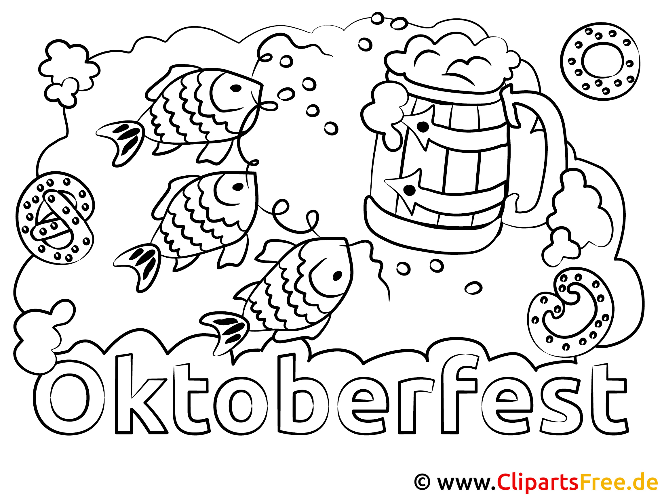 Das Ausmalbild zeigt eine fröhliche Szenen vom Oktoberfest! In der Mitte steht ein großes Bierkrug, über dem schaumige Blasen herumtanzen. Um den Krug herum schwimmen drei fischige Wesen, die mit fröhlichen Gesichtchen scheinen, als würden sie das Fest auch richtig genießen. Außerdem sind Brezeln im Bild – die sind ja ein echtes Highlight! Übrigens, oben und unten sind viele kleine, spaßige Details, die darauf warten, bunt gemacht zu werden. Kannst du dir vorstellen, mit verschiedenen Farben die Szene lebendig zu gestalten?