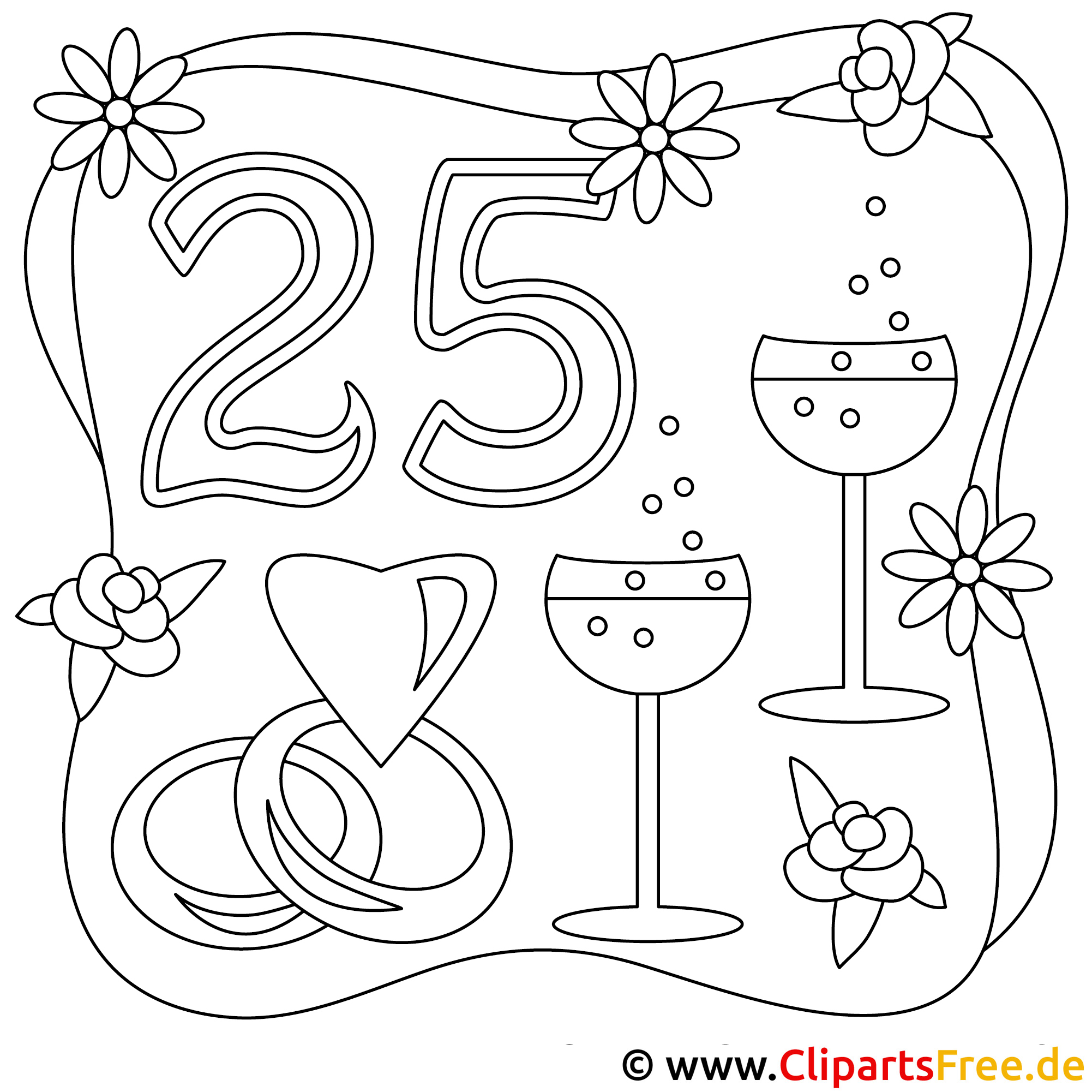Das Ausmalbild zeigt ein fröhliches, liebevolles Motiv, das dazu einlädt, kreativ zu werden. In der Mitte stehen der große Zahlenwert „25“ – perfekt für das Silberne Jubiläum! Damit verbunden sind zwei stilvolle Sektgläser, die für Feiern und Glücksmomente stehen. Um das Hauptmotiv herum blühen niedliche kleine Blumen, die den ganzen Rahmen lebendig wirken lassen. Und die beiden Eheringe, die ganz harmonisch im Bild platziert sind, erzählen von Liebe und langfristigen Bindungen. Dieses Bild hat einfach so viel Freude und festliche Stimmung zu bieten!
