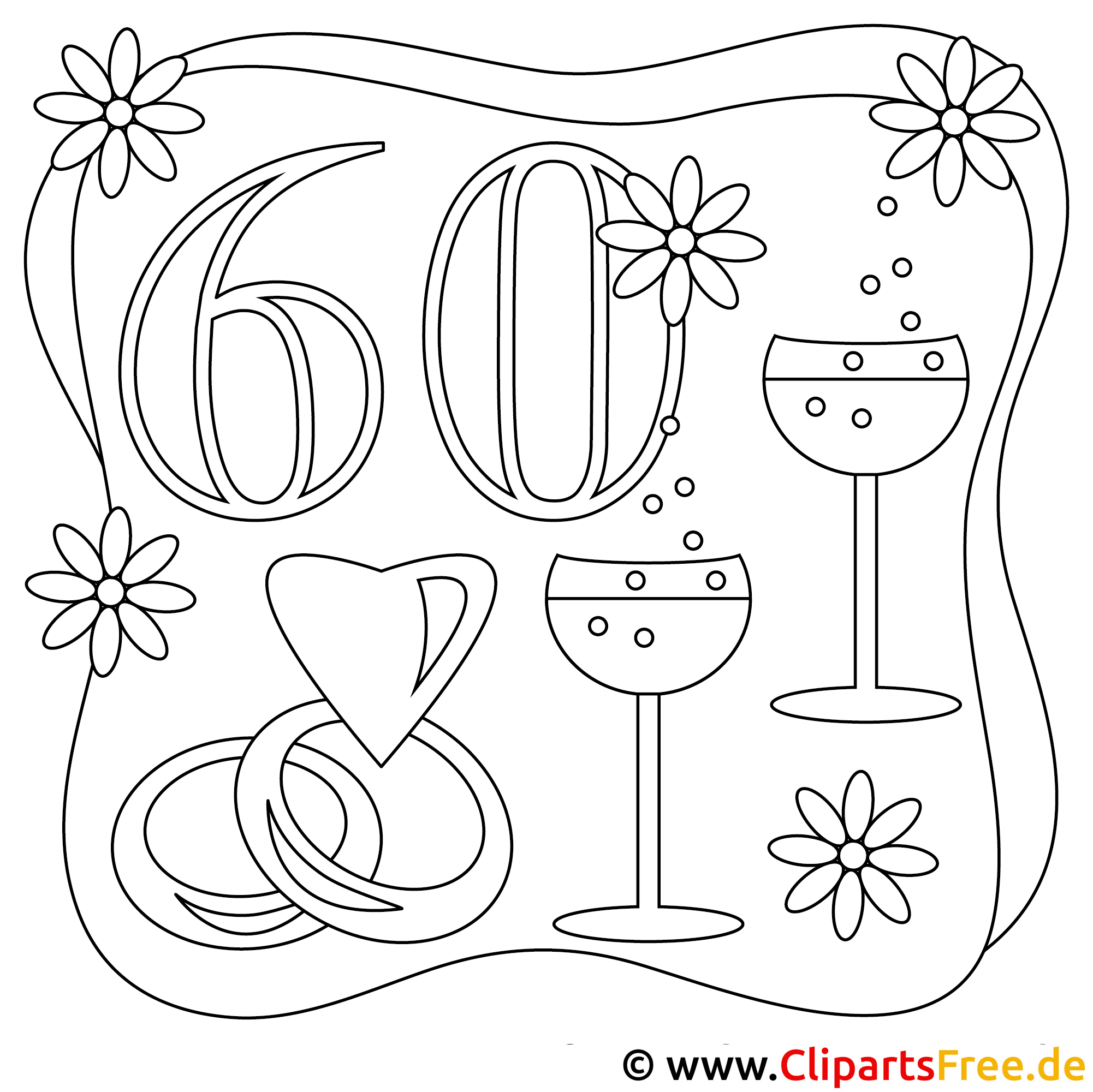 Dieses Malbild zeigt eine fröhliche Feier zum 60. Geburtstag. Die großen, geschwungenen Zahlen sind gut zu erkennen und laden dazu ein, sie in bunten Farben zu gestalten. Drumherum platzierten wir ein paar hübsche Blumen und zwei elegante Gläser, die auf das Feiern anstoßen! Und vergessen wir nicht die stilvollen Eheringe und ein Herz. Diese Kombination aus verschiedenen Elementen macht es perfekt für eine Feier oder einfach, um etwas Freude zu verbreiten.