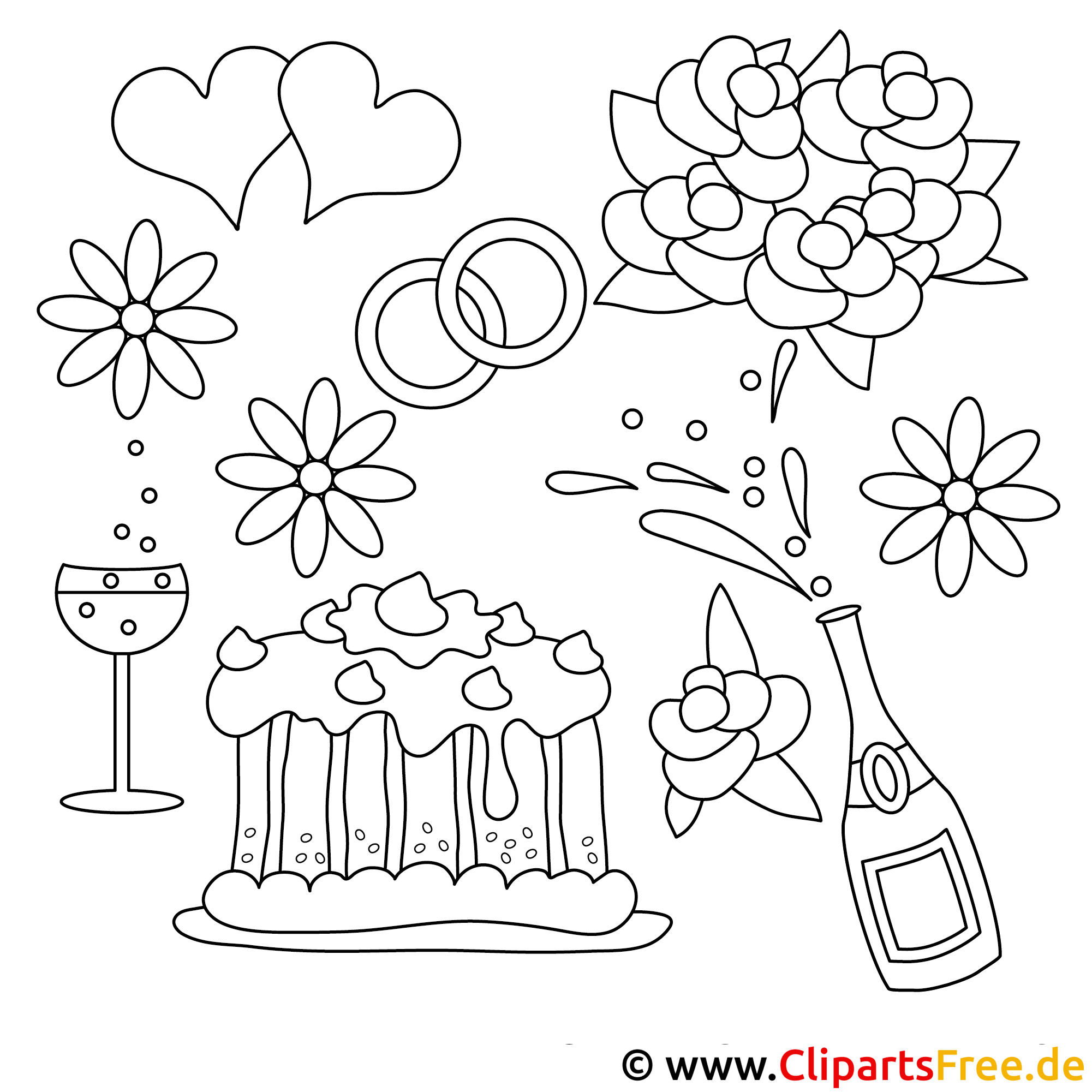 Hier haben wir ein richtig fröhliches Bild zum Ausmalen! Ja, genau! Es zeigt eine feierliche Szene mit vielen tollen Elementen. Da sind Herzen, Hochzeitsringe, Blumen und ein leckeres Tortenstück. Außerdem sprudelt eine Flasche – vielleicht Sekt oder etwas Ähnliches? Eigentlich perfekt für all diese besonderen Anlässe. Diese Malvorlage lässt viel Raum für Kreativität und Freude, ideal für alle, die es bunt mögen!