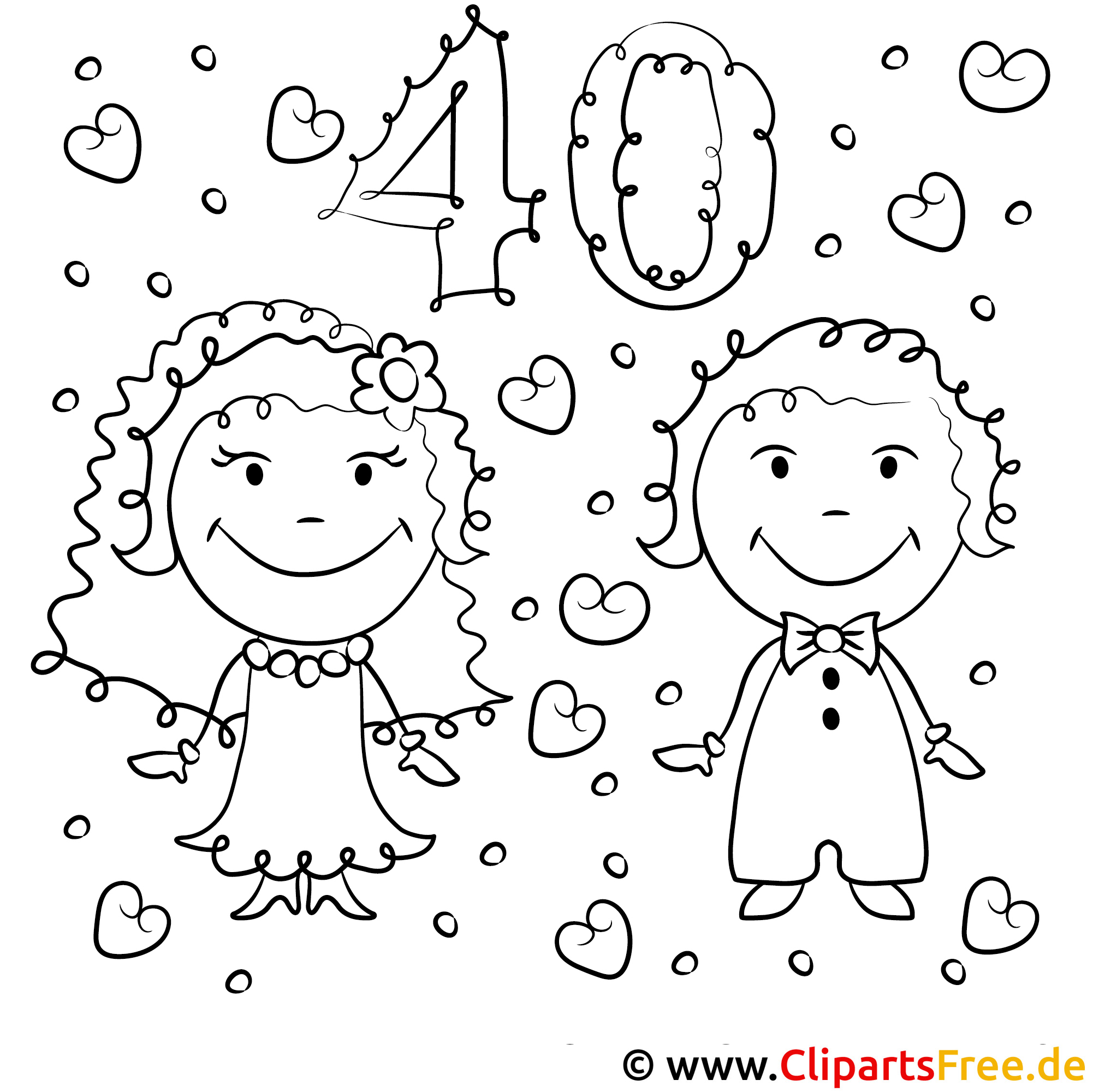 Auf dieser niedlichen Malvorlage siehst du ein fröhliches Paar, das offensichtlich einen besonderen Anlass feiert – was für ein Grund! Sie stehen sich gegenüber, umgeben von kleinen Herzen und dem großen, dekorativen Schriftzug "40". Die Figuren haben große, strahlende Augen und breite Lächeln. Der Junge trägt ein schickes Anzugoutfit mit einer kleinen Schleife, während das Mädchen in einem eleganten Kleid mit hübschen Details gekleidet ist. Diese Darstellung weckt Freude und lässt sofort an eine Feier denken. weißt du,