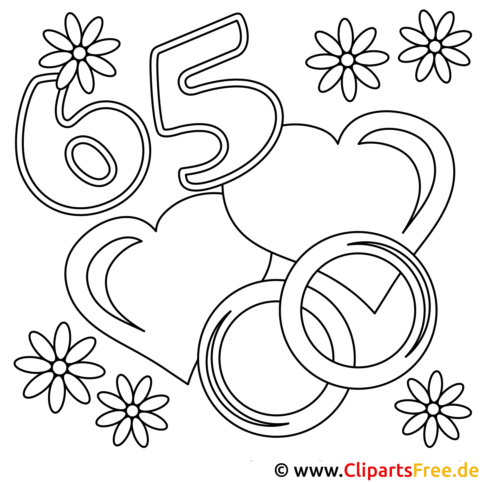 Dieses Ausmalbild zeigt eine fröhliche und festliche Komposition. Im Zentrum stehen die großen, verschnörkelten Zahlen „65“ – vier lustige Blumen umgeben sie spielerisch. Darunter befinden sich zwei verspielte Herzen und Ringe, die für Liebe und besondere Bindungen stehen. Es ist eine perfekte Vorlage, um Freude und Feiern zu symbolisieren. Zudem lächeln einem die kleinen Blumen entgegen, die mit ihren Kanten viel Raum für kreative Gestaltung bieten … . Hier kannst du Farben nach Lust und Laune anwenden!