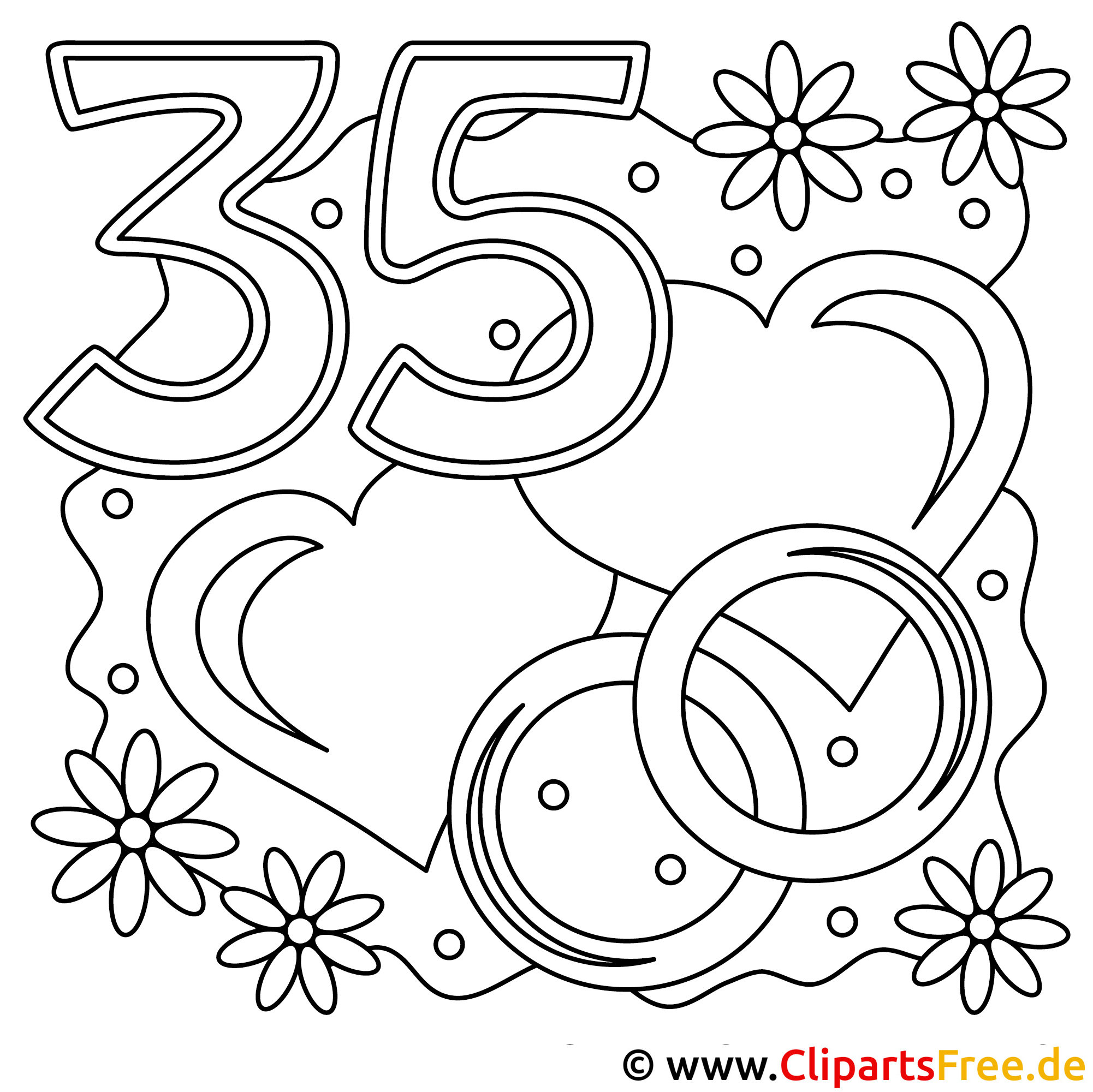 Dieses Ausmalbild zeigt die Zahlen „35“ umrahmt von diversen romantischen Elementen. Zwei große Herzen stechen sofort ins Auge, umgeben von witzigen Ornamenten und zarten Blumen, die das Gesamtbild auflockern. Die Szenerie wirkt lebhaft und einladend, perfekt für jede Gelegenheit, bei der Freude und Farbe im Vordergrund stehen. Stell dir vor, du malst die Herzen in leuchtenden Rottönen, während die Zahlen in Jubel-gelben Nuancen erstrahlen.