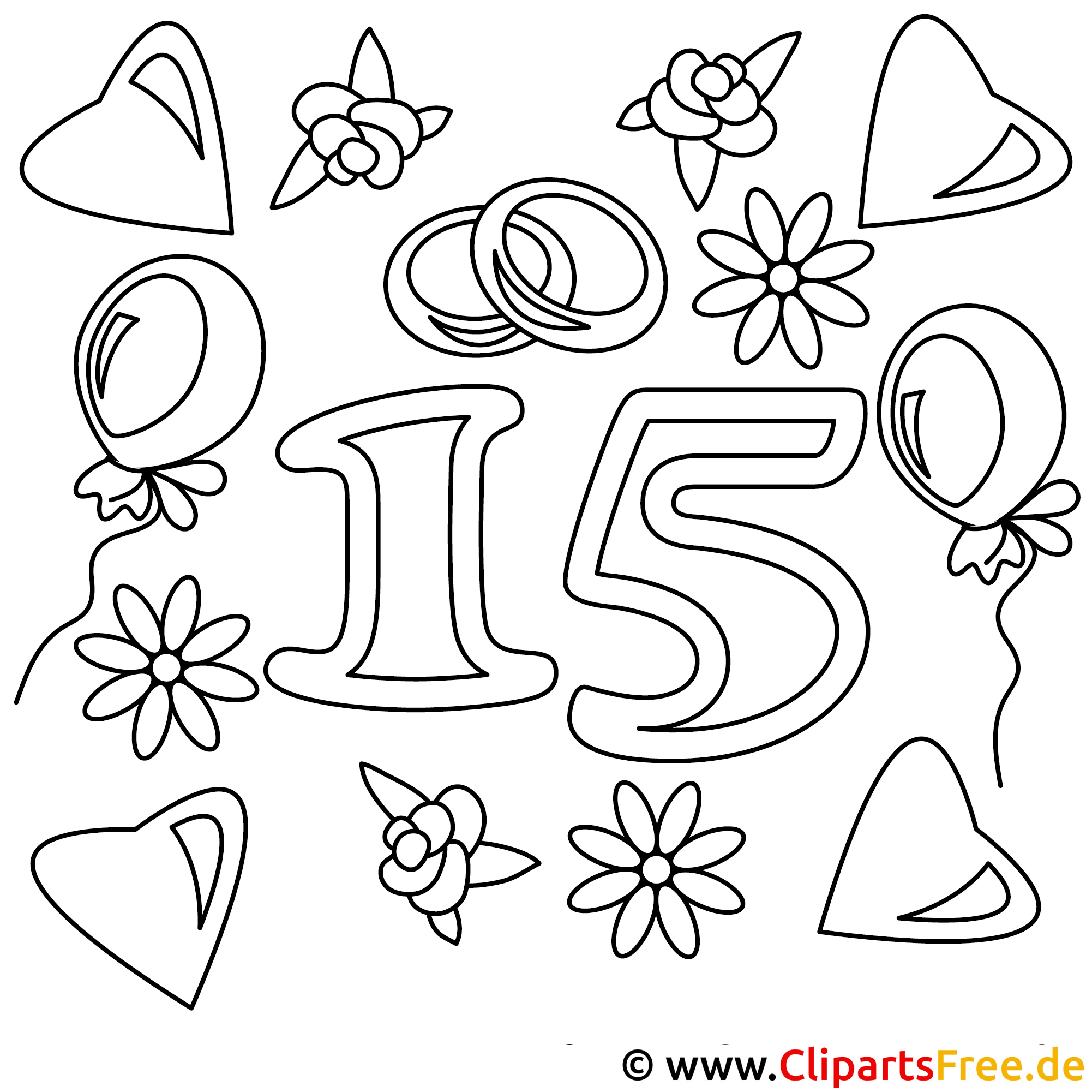 Das Malbild zeigt eine fröhliche Zusammenstellung mit dem großen, auffälligen Zahlenmotiv „15“. Umgeben von bunten Ballons, niedlichen Blumen und herzlichen Symbolen bildet es eine festliche Atmosphäre. Auch die Ringe sind in der Mitte platziert - ein schönes Detail, das das Bild besonders macht. Offensichtlich wurde hier an einen besonderen Anlass gedacht. Vielleicht ein Geburtstag oder ein Jubiläum?! Das Bild lädt einfach dazu ein, bunt gestaltet zu werden. Der Fantasie sind dabei keine Grenzen gesetzt!