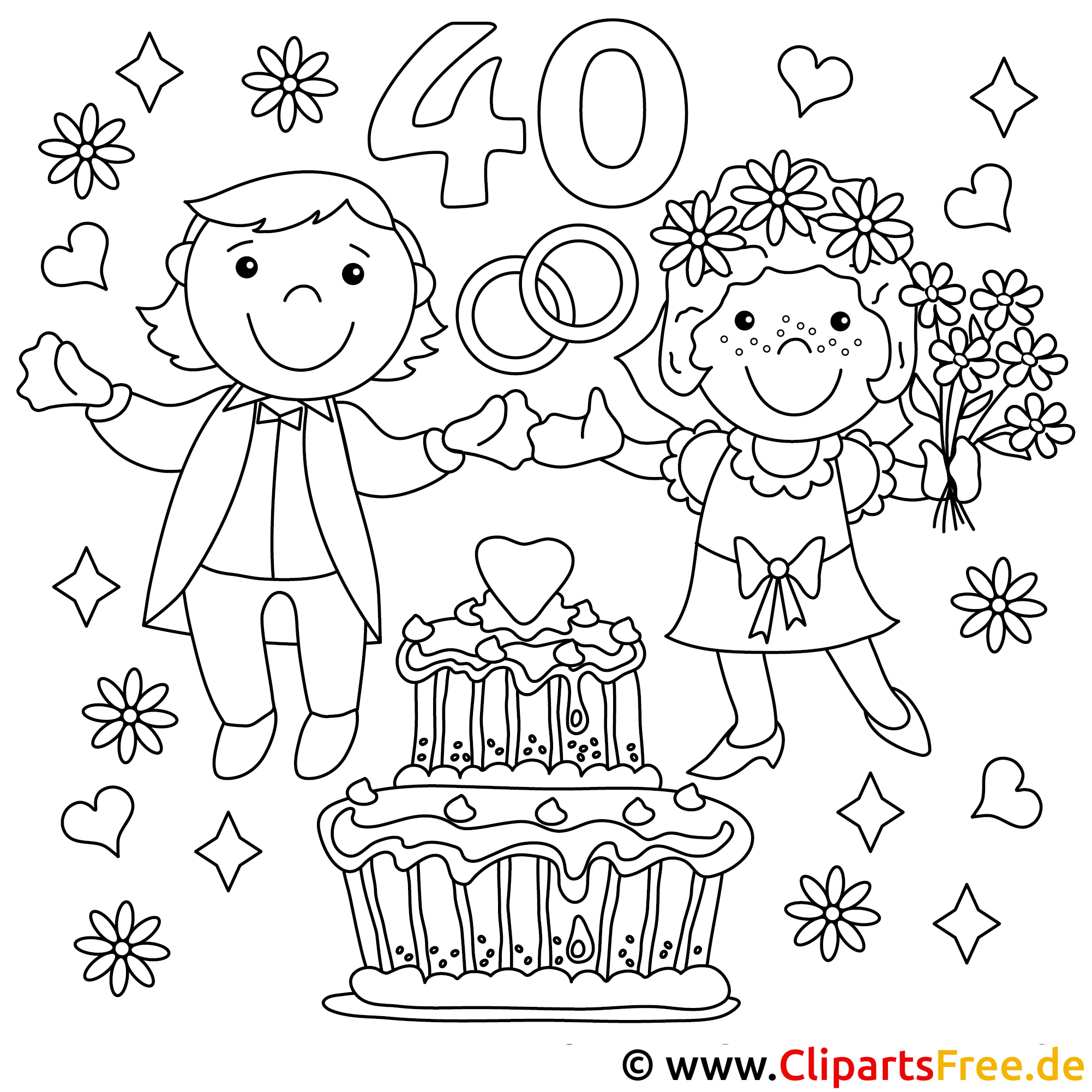 Das Ausmalbild zeigt zwei fröhliche Figuren - einen Jungen und ein Mädchen - die sich die Hände halten. Um sie herum sieht man hübsche Blumen, kleine Herzen und die Zahl 40. Der Junge trägt einen Anzug, während das Mädchen in einem festlichen Kleid mit einer Schleife strahlt. In der Mitte des Motivs stehen zwei große Torten, die mit einer leckeren Zuckerglasur bedeckt sind. Fast schon verführerisch, oder? Das Bild ist ideal für Anlässe wie Jubiläen oder Geburtstagsfeiern.