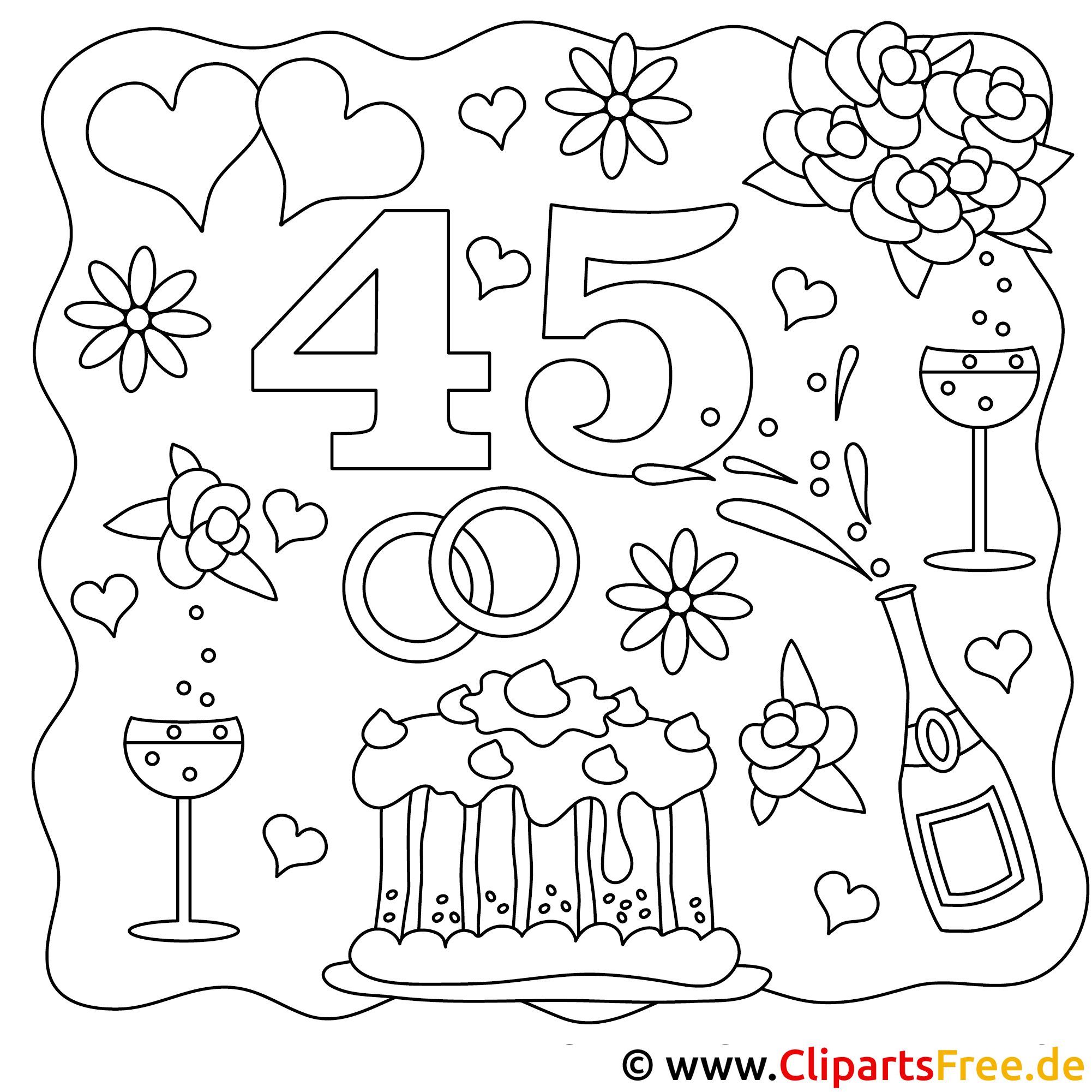 Das Bild, das du hier siehst, ist ein fröhliches Motiv, das perfekt zum Ausmalen geeignet ist. Mit der großen Zahl „45“ hebt sich das Bild wunderbar ab – eine tolle Vorlage, um einen besonderen Jahrestag oder ein Jubiläum zu feiern! Rund um die Zahl gibt es viele hübsche Details, wie Blumen, Herzen und feierliche Elemente wie Gläser und eine prall gefüllte Torte. Diese kleine Komposition ist einfach bezaubernd und lädt zum Kreativsein ein.