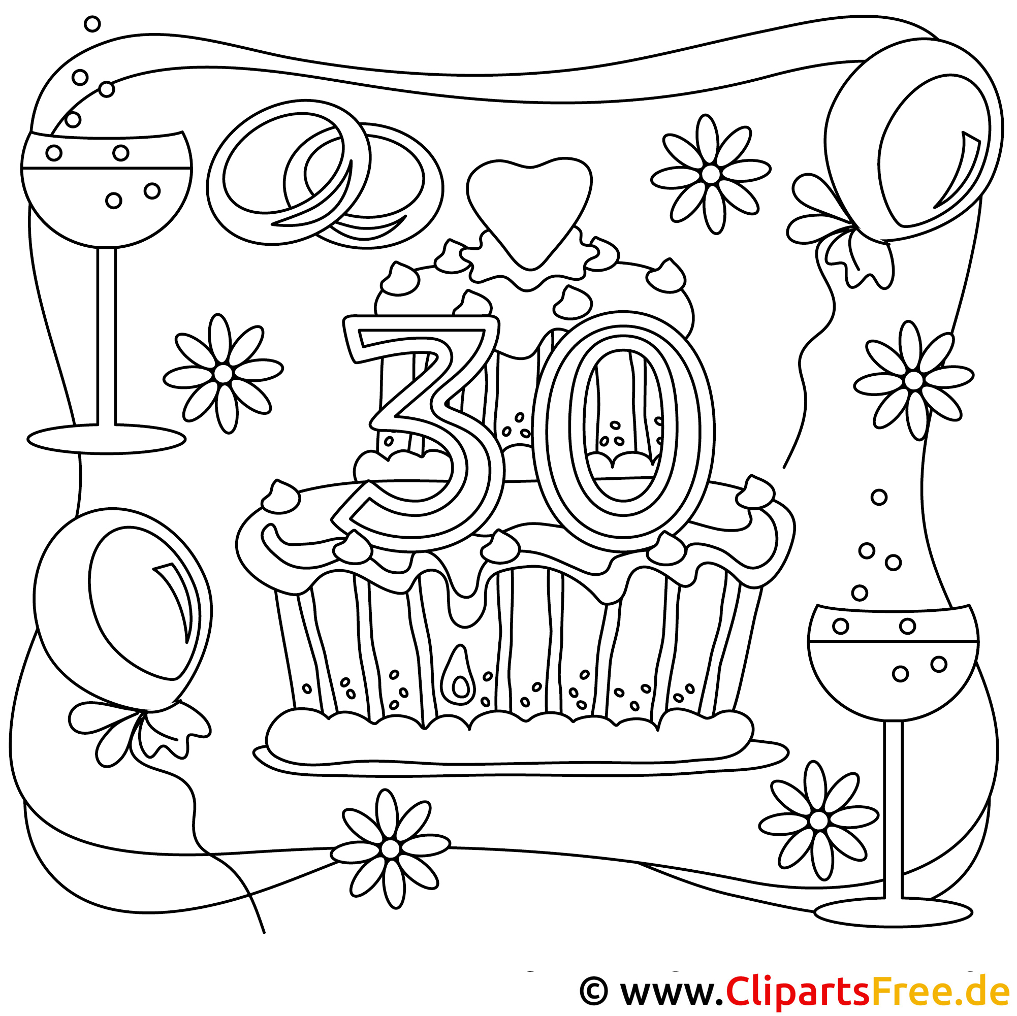 Hier siehst du eine fröhliche Ausmalvorlage mit einer bunten Geburtstagstorte. Diese Torte hat drei stöckige, hübsch gewickelte Böden mit einer großen „30“ oben drauf. Ein Herz ziert die Spitze, und runde Kekse sind drumherum platziert. Um die Torte herum gibt es viele kleine Details, wie beispielsweise Blumen, Luftballons und Gläser mit sprudelnden Getränken. Es ist wirklich eine tolle Szene, die perfekt zu einem dreißigsten Geburtstag passt.