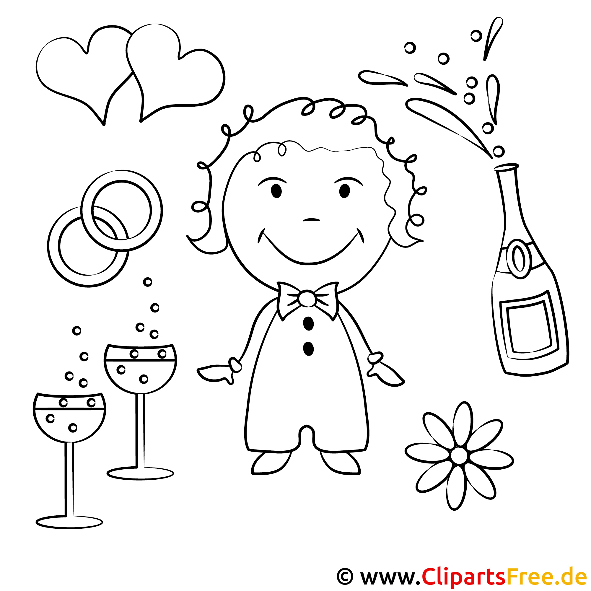 Hier haben wir ein fröhliches Ausmalbild, das eine heitere Figur zeigt. Der kleine Junge mit lockigen Haaren trägt einen entzückenden Anzug und eine Krawatte. Um ihn herum findest du verschiedene tolle Details: zwei Herzen, die für Liebe stehen, goldene Ringe, die an eine Hochzeit erinnern, prickelnde Gläser mit Sekt und eine sprudelnde Flasche. Ein Blumenmotiv rundet das Bild ab und sorgt für eine fröhliche Stimmung.