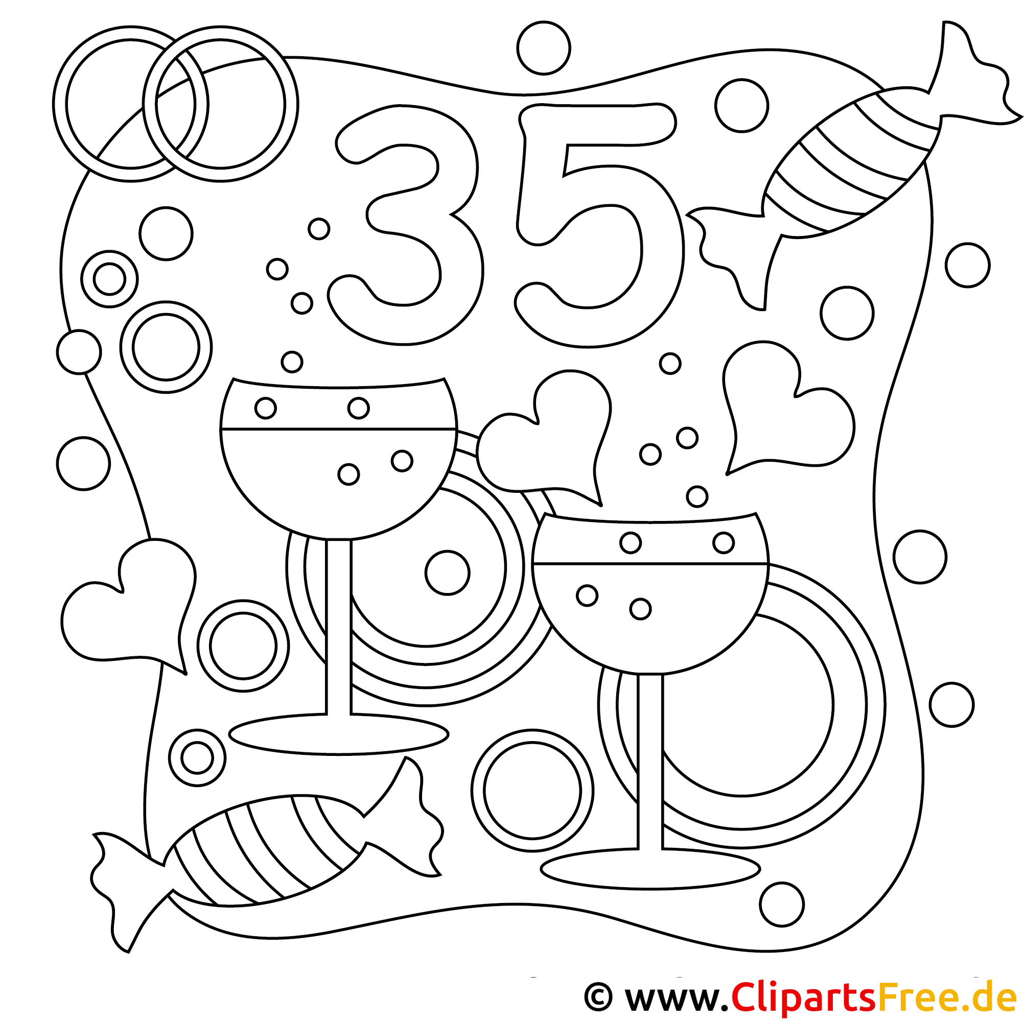 Hier haben wir ein schon richtig fröhliches Ausmalbild, das total vielseitig ist! Es zeigt Gläser mit einem leckeren Getränk, einige Herzen und Bonbons, die das Ganze super bunt und festlich machen. Logo, die Zahl 35 zieht sofort die Aufmerksamkeit auf sich – perfekt für besondere Anlässe! Dazu stehen farbenfrohe Kreise an den Rändern, und das alles zusammen schafft eine entspannte und fröhliche Stimmung. Echt zum reinsetzen und die Sorgen vergessen, oder?