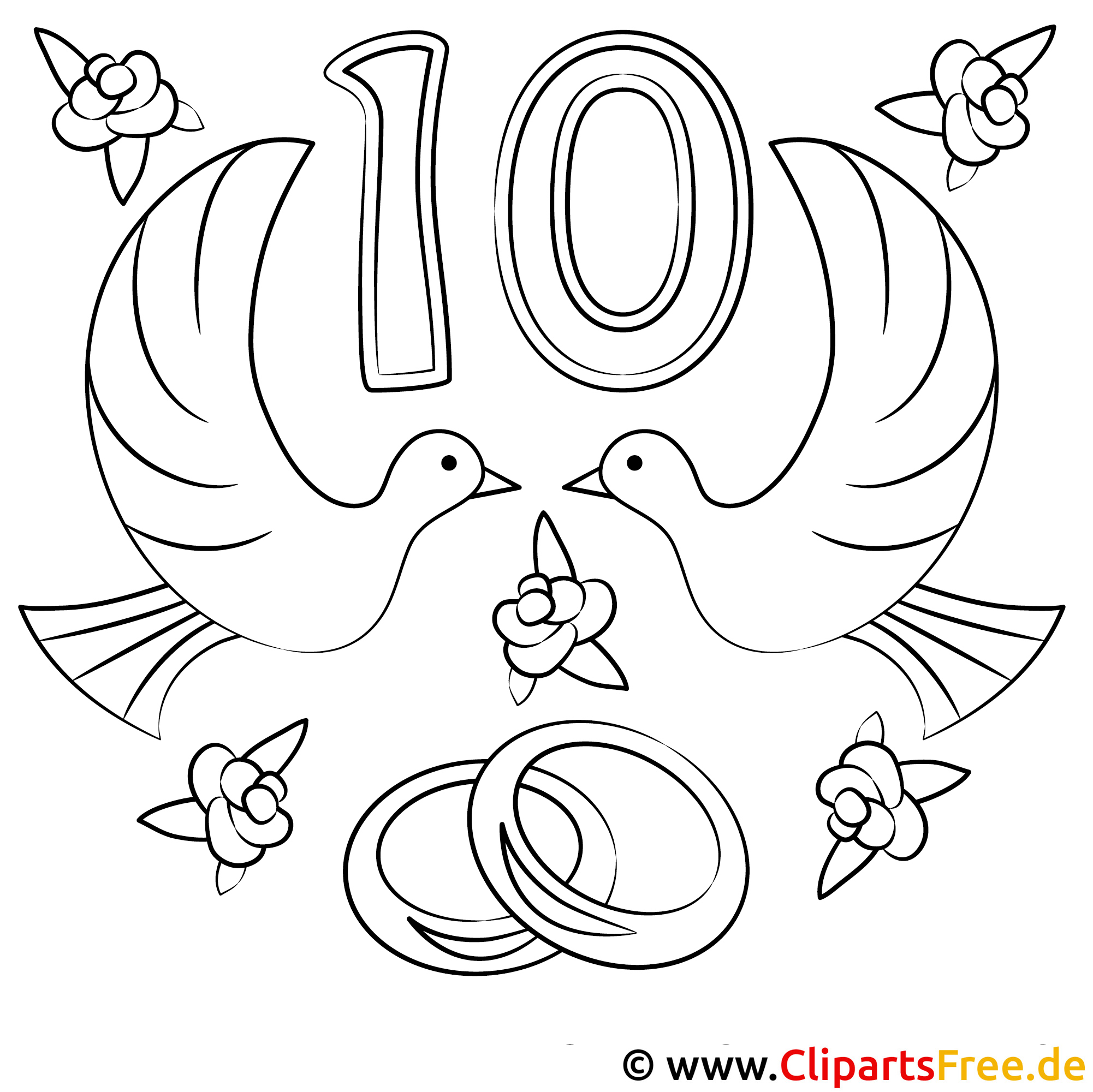 Das hier gezeigte Ausmalbild ist einfach und schön zugleich! Es zeigt zwei liebenswürdige Vögel, die neugierig nebeneinander sitzen. Overhead schwebt eine große „10“ – ein Zeichen für ein besonderes Jubiläum oder vielleicht eine Feier. Zudem sind um die Vögel herum noch hübsche kleine Blumen und zwei Ringe angeordnet. Eine charmante Kombination, die Freude und Liebe symbolisiert. weißt du, Herrlich, nicht wahr? Hier kann man seinem kreativen Elan freien Lauf lassen.