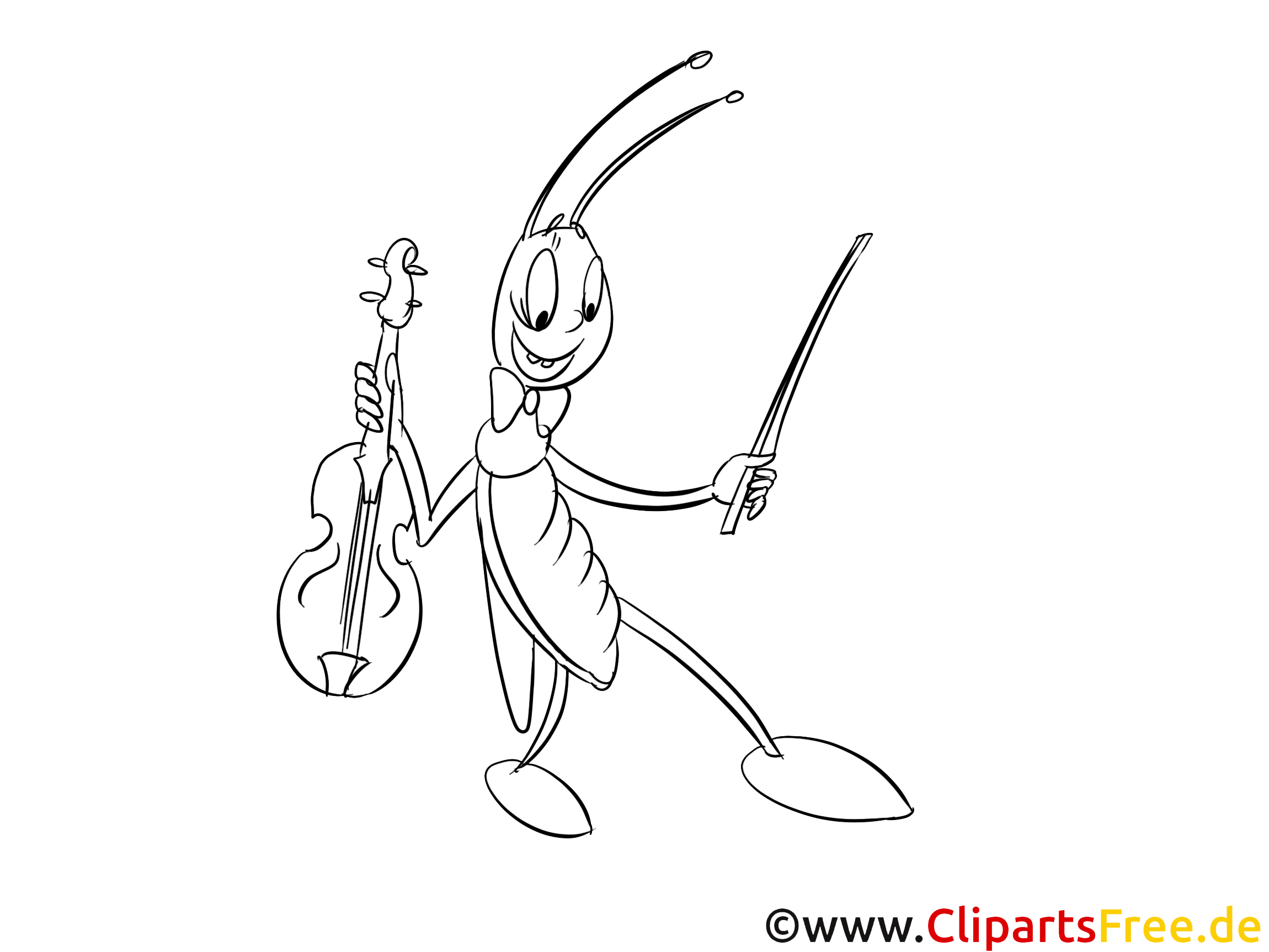Der Zeichenstil ist cartoonhaft und leicht skurril. halt, Die Konturen sind klar und umreißen die Grille auf eine lustige Weise, die sie sehr ansprechend für Kinder macht. Die großen Augen und die übertriebenen Proportionen tragen zur Komik bei, während die feinen Details, wie die Saiten der Violine, die Qualität des Bildes unterstreichen.... Man möchte fast sofort zum Stift greifen und Farbe hineinbringen! Ob knallige Farben oder zarte Pastelltöne, dieser Stil erlaubt viel Kreativität – jeder kann etwas ganz eigenes daraus machen.