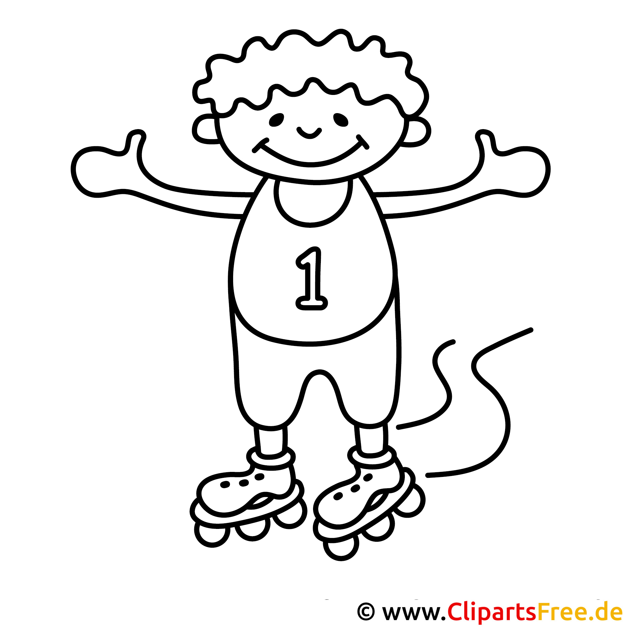 Das Bild zeigt einen fröhlichen Jungen auf Rollskates. Er hat wunderbar lockige Haare, die richtig lustig aussehen! Seine Arme sind weit ausgebreitet, als ob er gerade dabei ist, seinen tollen Schwung zu zeigen. Auf seinem Shirt steht die Nummer "1", was super cool wirkt. Diese Abbildung strahlt pure Lebensfreude aus und lädt einfach dazu ein, künstlerisch aktiv zu werden.