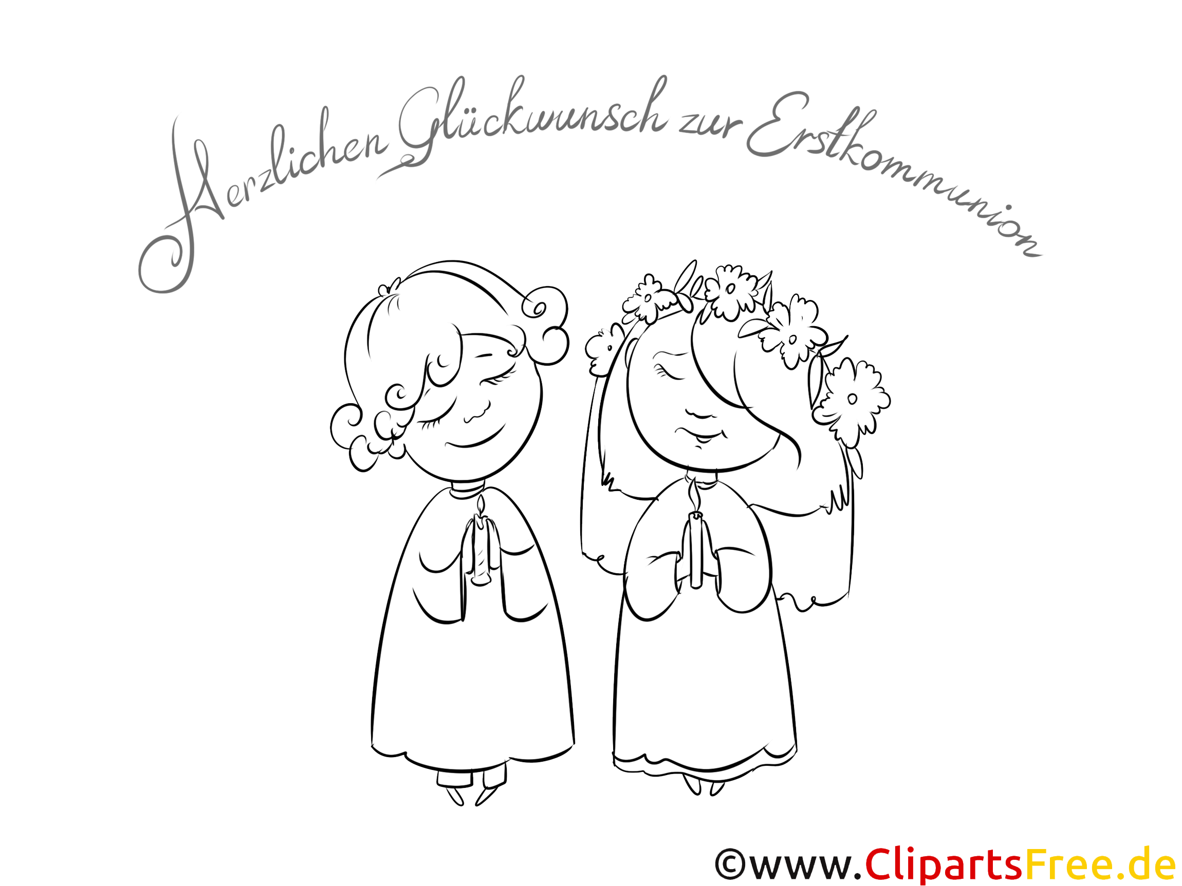 In diesem bezaubernden Ausmalbild sehen wir zwei kleine Mädchen, die zur Erstkommunion feiern. Sie stehen eng beieinander, strahlen vor Freude und halten ihre Hände zusammen. Ihre hübschen langen Kleider und die liebevollen Details wie die Blumenkronen auf ihren Köpfen verleihen dem Bild einen besonderen Charme. Über ihnen schwebt der Schriftzug „Herzlichen Glückwunsch zur Erstkommunion“. sozusagen, Es steckt eine ganz besondere Aura darin – man kann geradezu die Freude und den Stolz spüren, die in solchen Momenten oft präsent sind. also, Die Zeichnung lädt regelrecht ein, immer wieder neu ausgemalt zu werden.