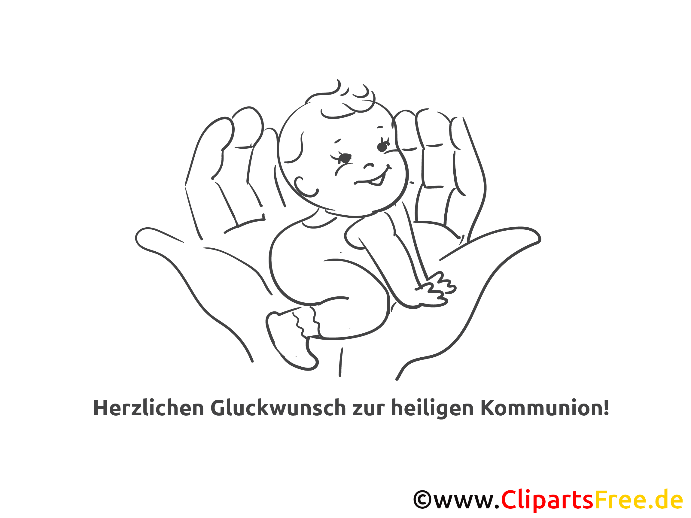 In diesem süßen Ausmalbild sieht man ein kleines Baby, das munter auf zwei großen Händen sitzt. Die Hände wirken beschützerisch und stabil, während das Baby lächelt und einen neugierigen Ausdruck hat. Es vermittelt irgendwie ein Gefühl von Sicherheit und Geborgenheit, oder? Darüber steht der Schriftzug „Herzlichen Glückwunsch zur heiligen Kommunion!“. Es ist eine niedliche und einzigartige Darstellung für diesen besonderen Anlass, die herzlich und einladend wirkt.