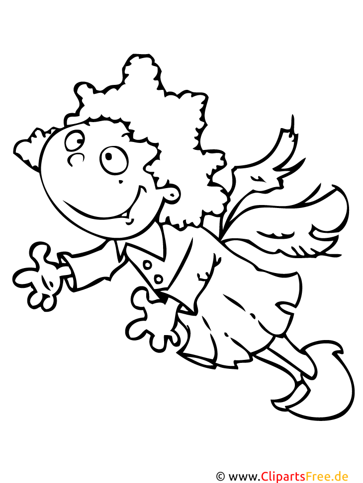 Das vorliegende Ausmalbild zeigt ein fröhliches kleines Wesen mit großen, neugierigen Augen und lockigem Haar. Diese fantasievolle Figur fliegt durch die Luft – oder vielleicht schwebt sie just in einem magischen Moment? Die kleinen Flügel an den Seiten und das besondere Outfit verleihen dem Bild eine zauberhafte Note. Die Kleidung sieht aus wie ein knielanges Kleid mit einer artiges Sakko. Ihr Gesicht strahlt Lebensfreude aus, was jedem Betrachter gleich ein Lächeln ins Gesicht zaubert – herzallerliebst, nicht wahr?