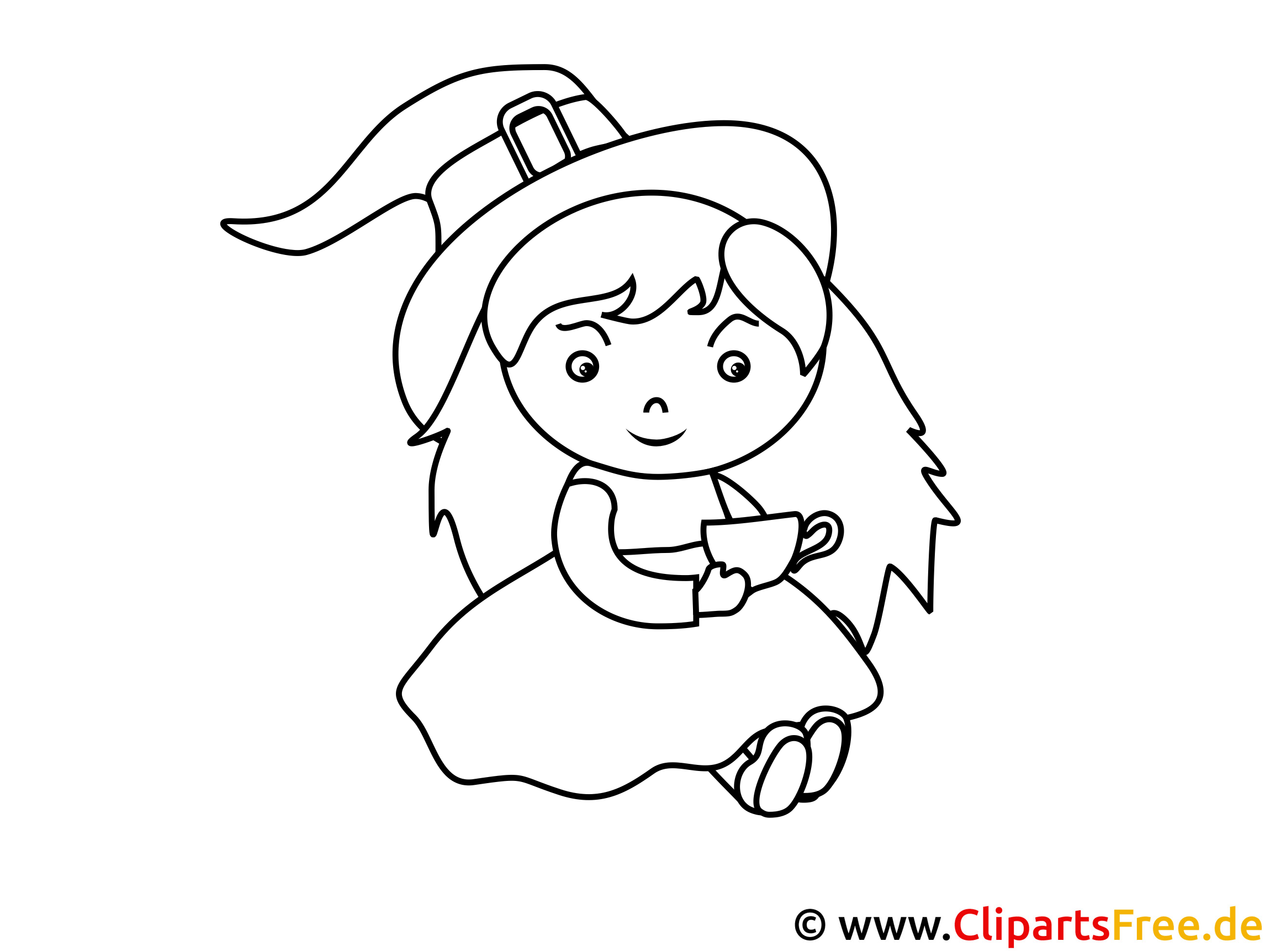 Hexe trinkt Tee Bild-Malvorlage zum Drucken und Ausmalen