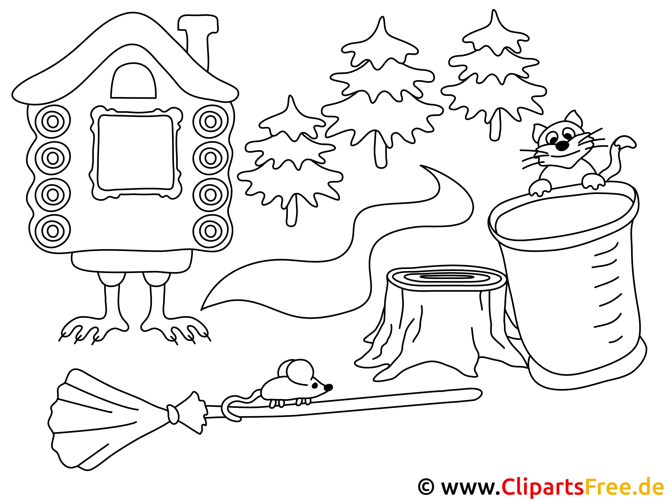 Hier haben wir ein zauberhaftes Ausmalbild, das richtig viel Freude macht! Stell dir vor, da steht ein kleines, charmantes Häuschen mit großen Fenstern, die darauf warten, bunt gestaltet zu werden. Daneben strecken sich fröhlich mehrere grüne Tannenbäume in den Himmel. Sie passen perfekt zu dem fröhlichen Kätzchen, das auf einem Kübel sitzt und neugierig schaut. Und schau mal, auch eine süße Maus ist mit dabei, die auf einem Besen sitzt. Das Bild lädt geradezu ein, kreativ zu sein und seinen Fantasien freien Lauf zu lassen!