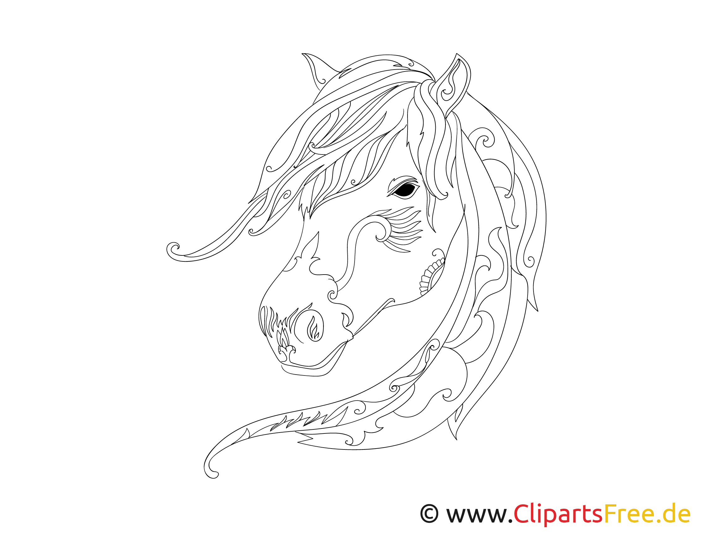 Hier haben wir ein wunderschönes Ausmalbild eines majestätischen Pferdes. Das kunstvoll gezeichnete Pferdegesicht hat sanfte Linien und elegante Details, die das fließende Haar betonen. Man sieht die geschwungenen Formen und filigranen Muster, die ein fantastisches Gefühl von Bewegung und Freiheit vermitteln. Wenn man den Blick darauf richtet, ertappt man sich dabei, zu träumen – von weitläufigen Wiesen und unbeschwerten Ausritten. weißt du, Die Form des Kopfes und die liebevollen Details laden geradezu dazu ein, Farben zu wählen.