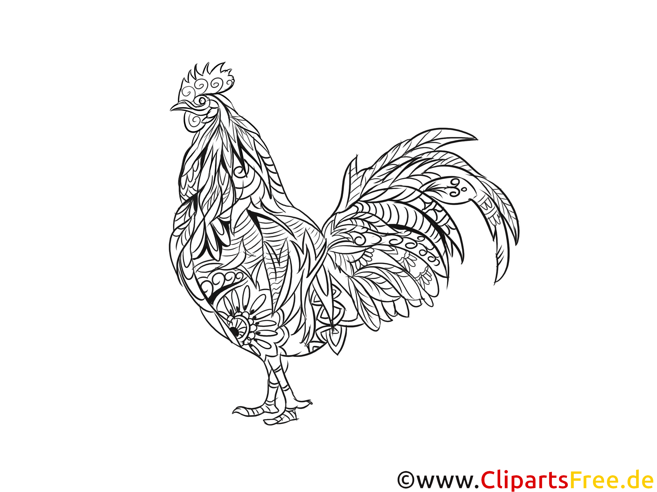 Hier haben wir ein echt cooles Motiv: einen prächtigen Hahn, der voller Leben und Farben steckt! Der Hahn steht stolz da, seine langen Federn sind mit vielen, vielen Details verziert. Es gibt Blumen, Blätter und andere schöne Muster – einfach super, um kreativ zu sein! Stellen Sie sich mal vor, wie der Hahn lebendig wird, wenn ihr ihn mit euren Lieblingsfarben ausmalt. Das wird richtig bunt!